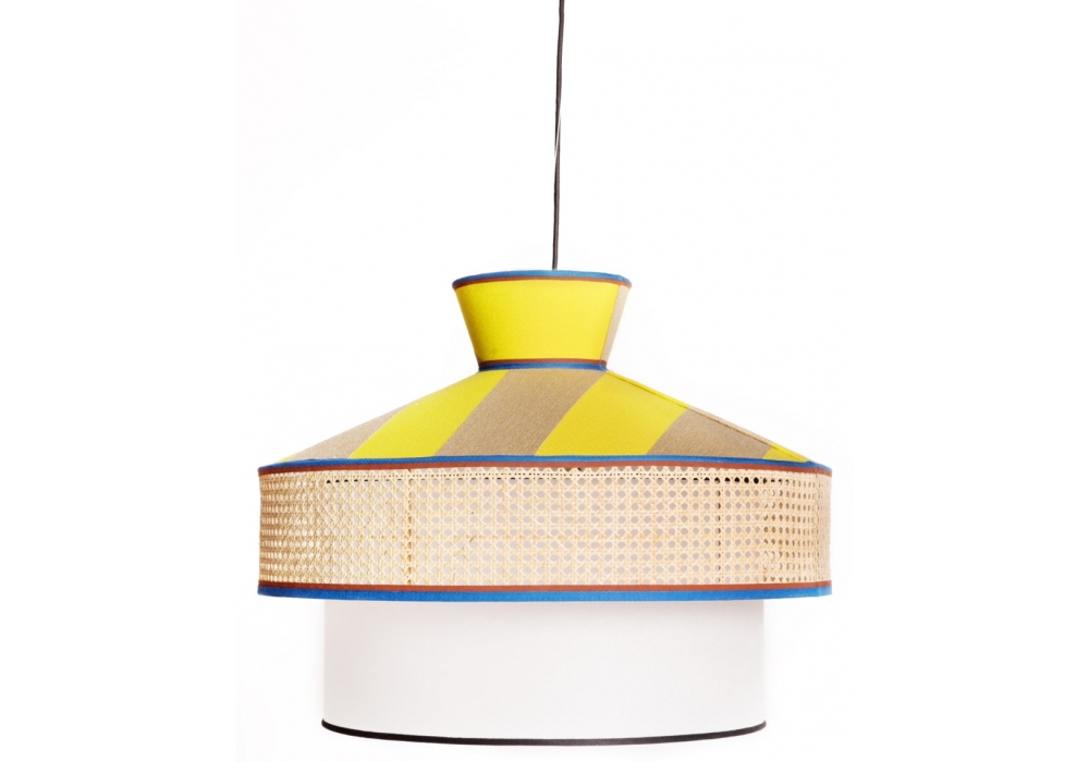 Wagasa diseñada por Gebrüder Thonet Vienna es una lámpara de suspensión con pantalla de tela, disponible en diferentes versiones. Difusor de luz de pergamino. Inserciones de paja de Viena.