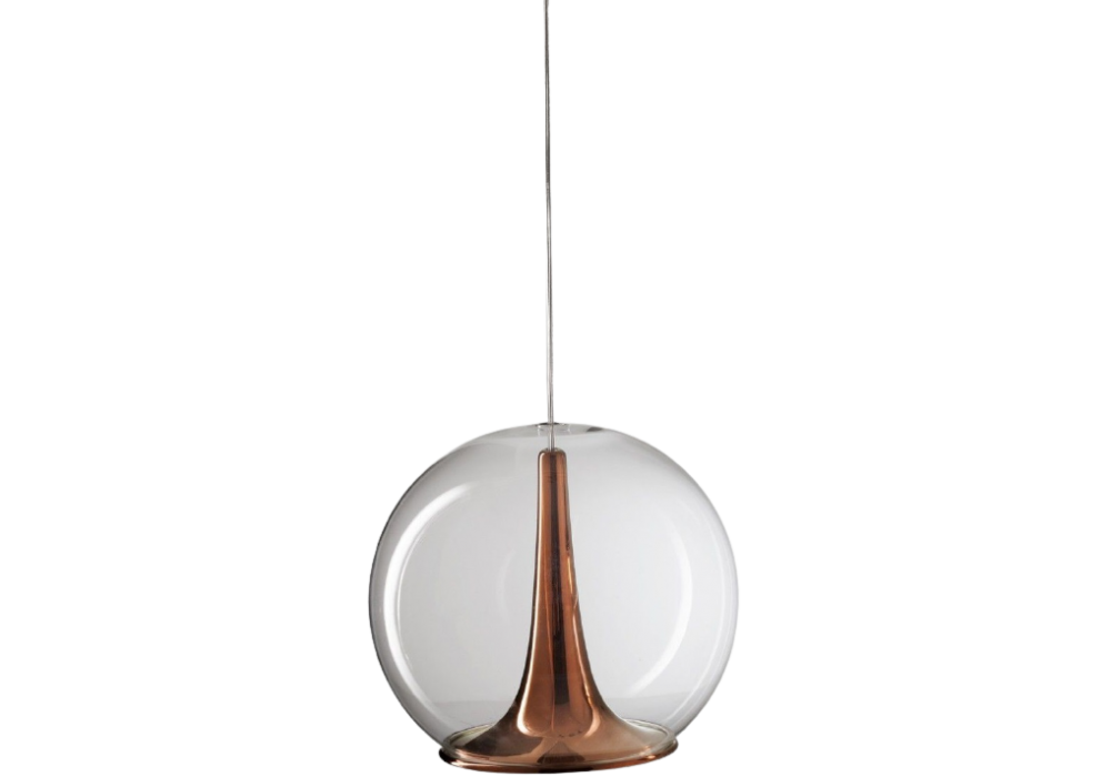 Trumpet diseñada por Matteo Zorzenoni para Bosa es una lámpara de suspensión con pantalla de vidrio y estructura interna en cerámica vidriada. Disponible en dos tamaños.