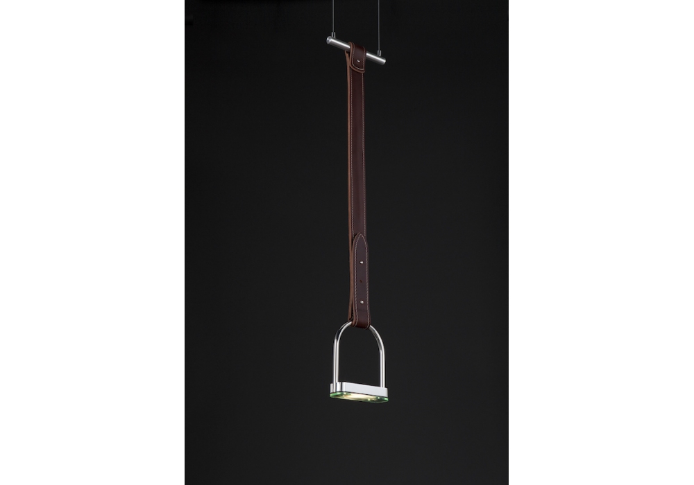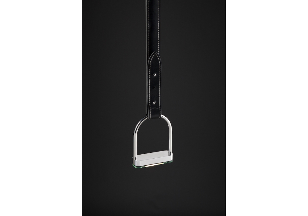 Stirrup diseñada por Sybille van Gammeren para Quasar es una lámpara de suspensión con rosetón circular en metal pintado de negro y placa cromada. El cuerpo de la lámpara está fabricado en aluminio sostenido por una correa de cuero negra o marrón. La fuente de luz adoptada es de tipo LED integrada.