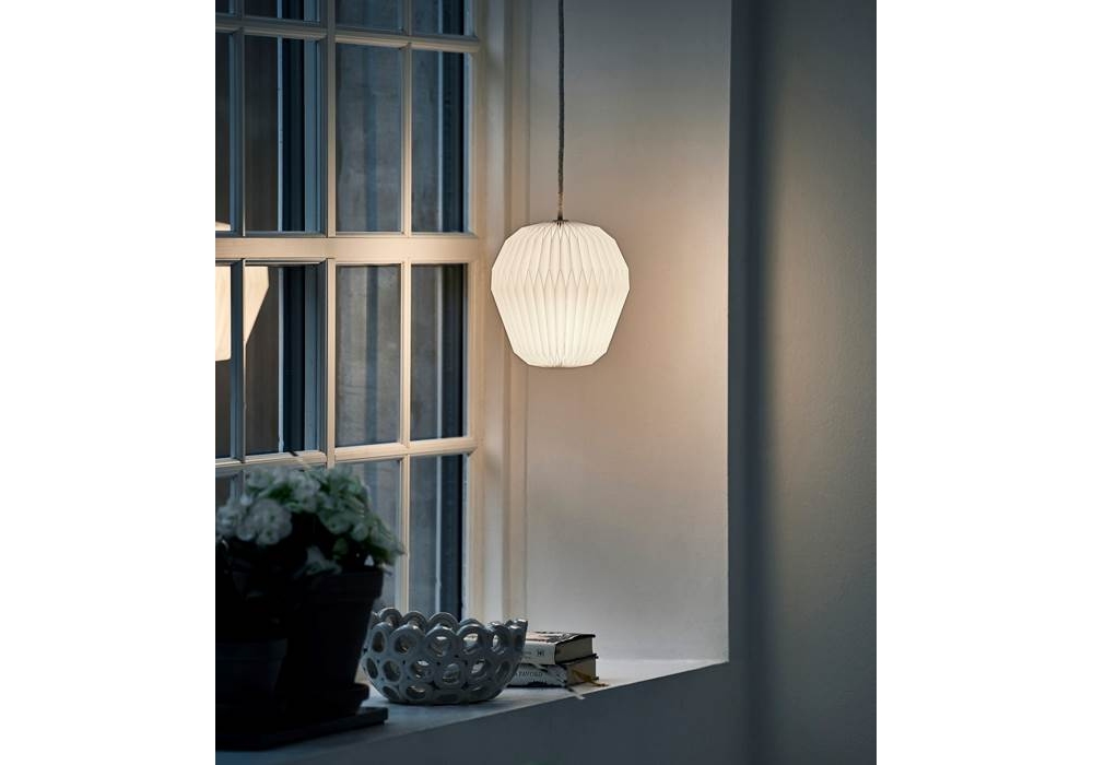 Bouquet diseñada por Sinja Svarrer para Le Klint es una lámpara de suspensión estructurada por la combinación de plástico y madera. La pantalla grande está hecha de material plástico o papel con una superficie con pliegues regulares y precisos para garantizar una difusión óptima de la luz. El cuerpo de la lámpara es de madera de roble y utiliza fuentes de luz LED o halógenas (no incluidas). El Bouquet está disponible en diferentes tamaños.