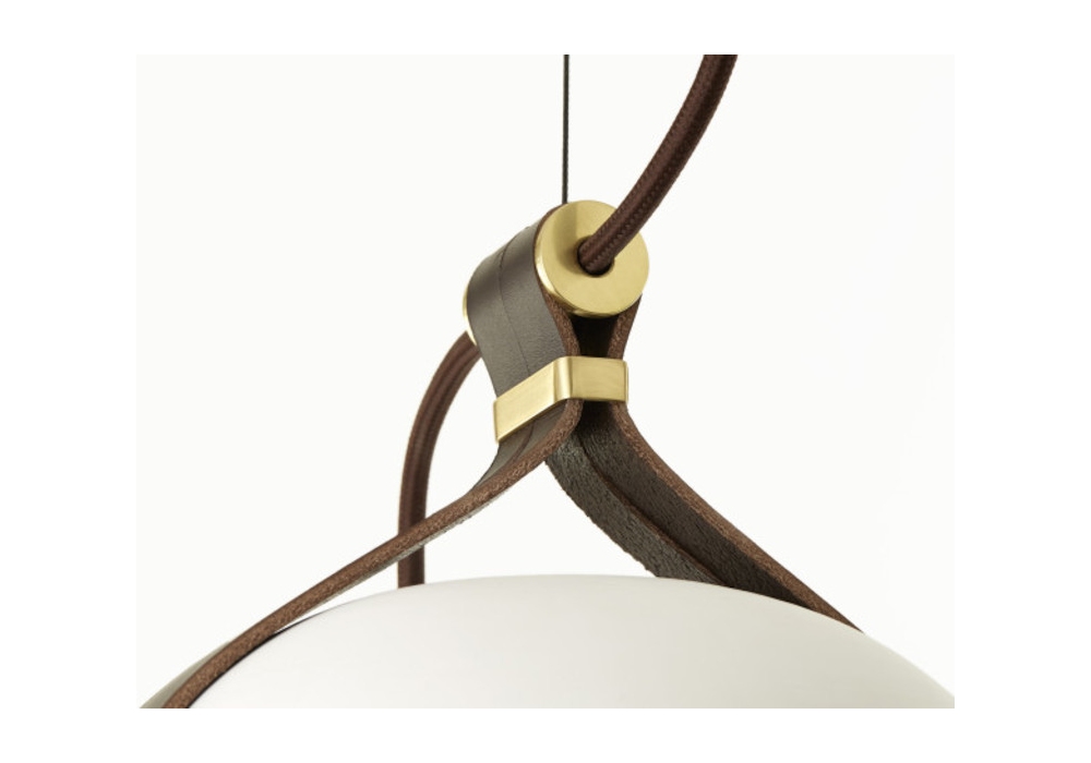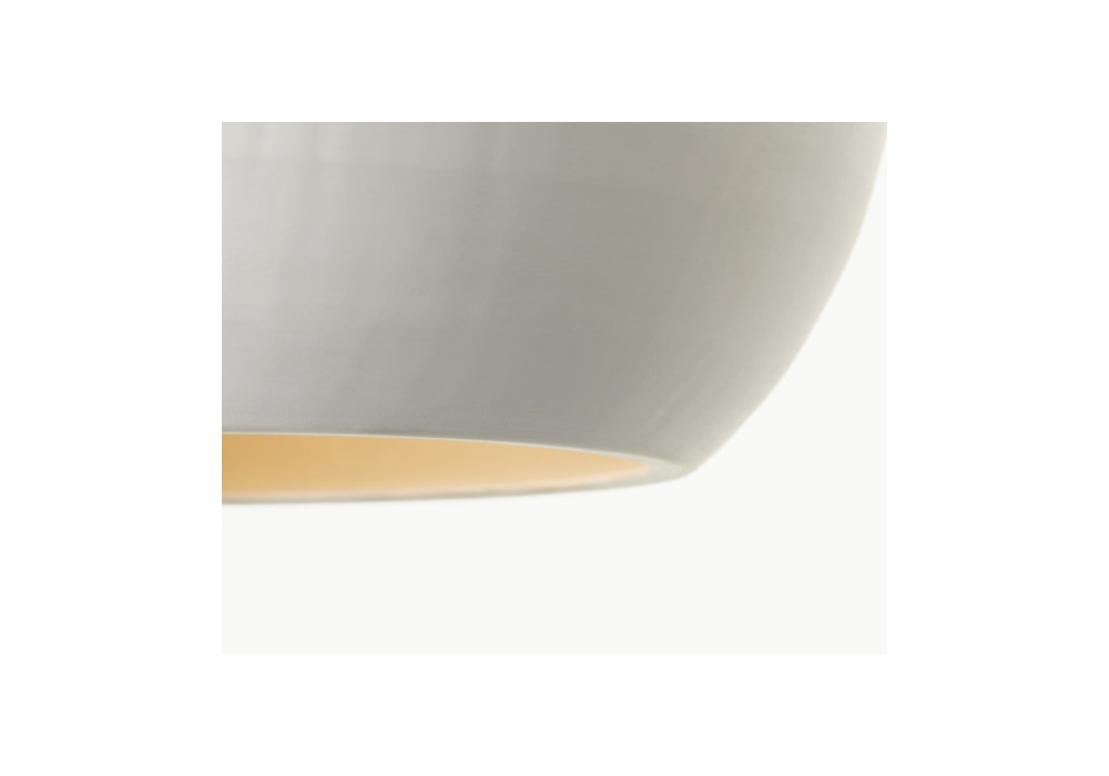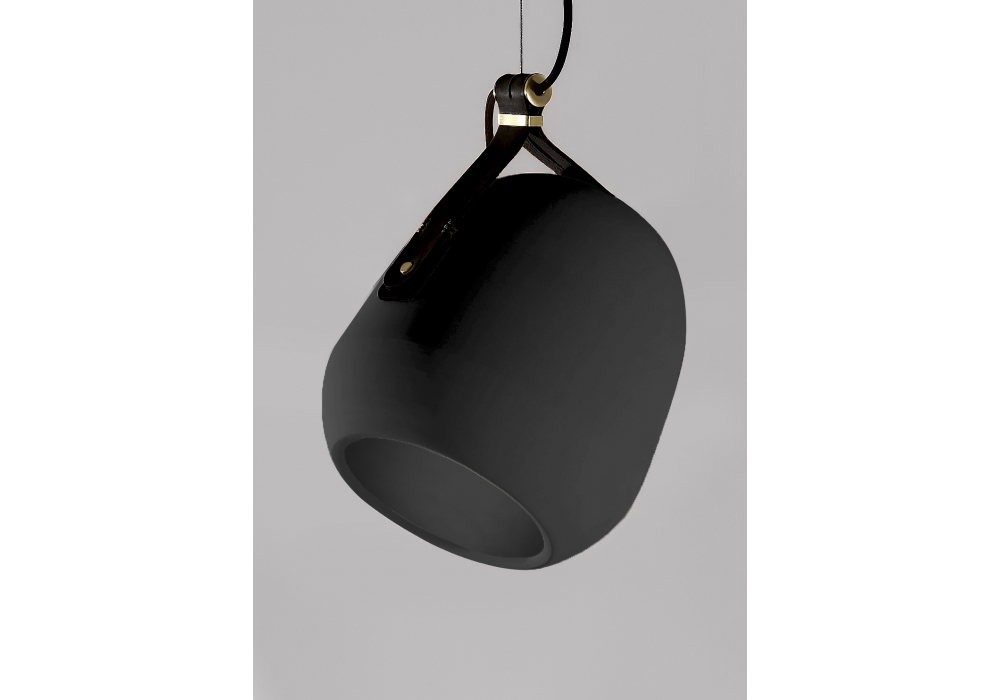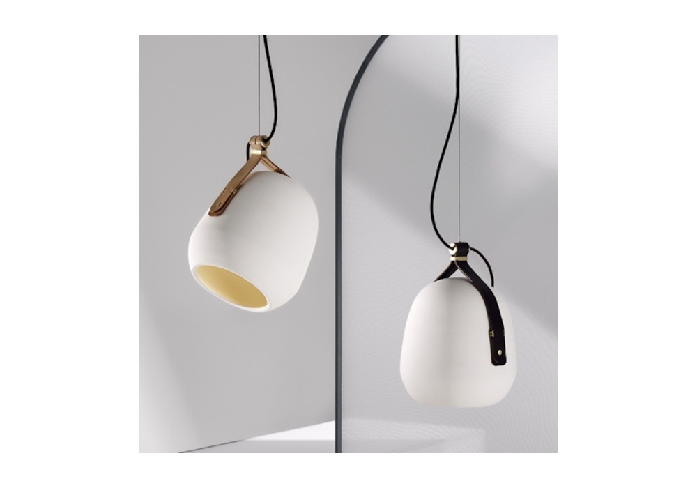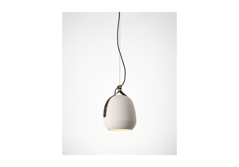 Stone Cow diseñada por Rakumba es una lámpara de suspensión realizada en cerámica, exterior opaco, interior brillo. Bisagra de cuero, cable de latón macizo pulido. La lámpara está disponible en diferentes acabados.