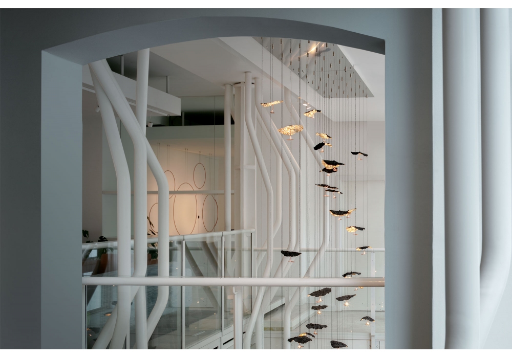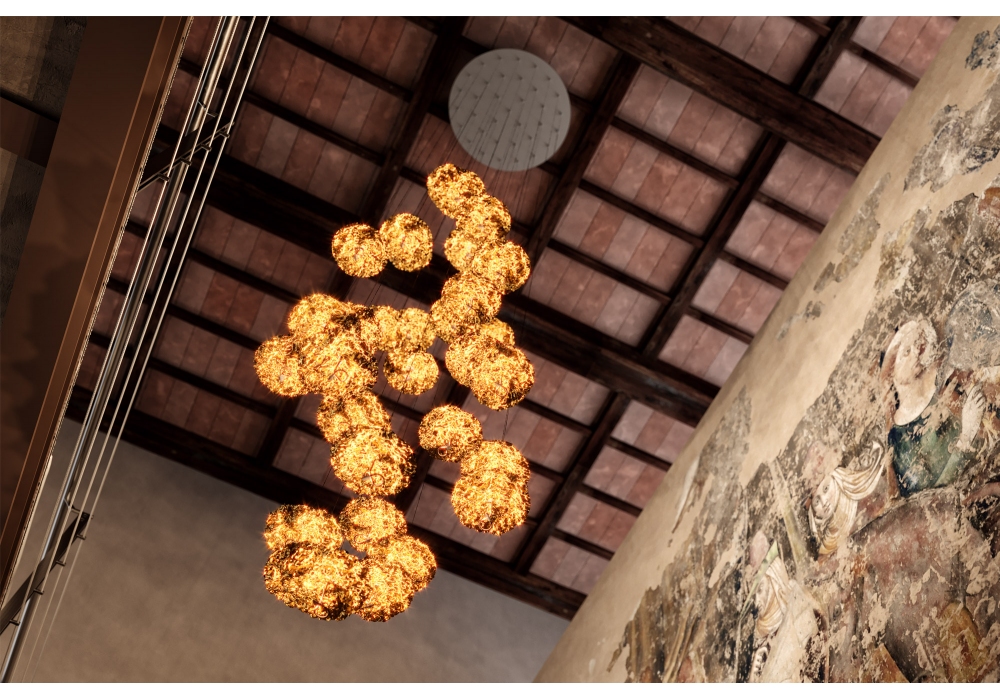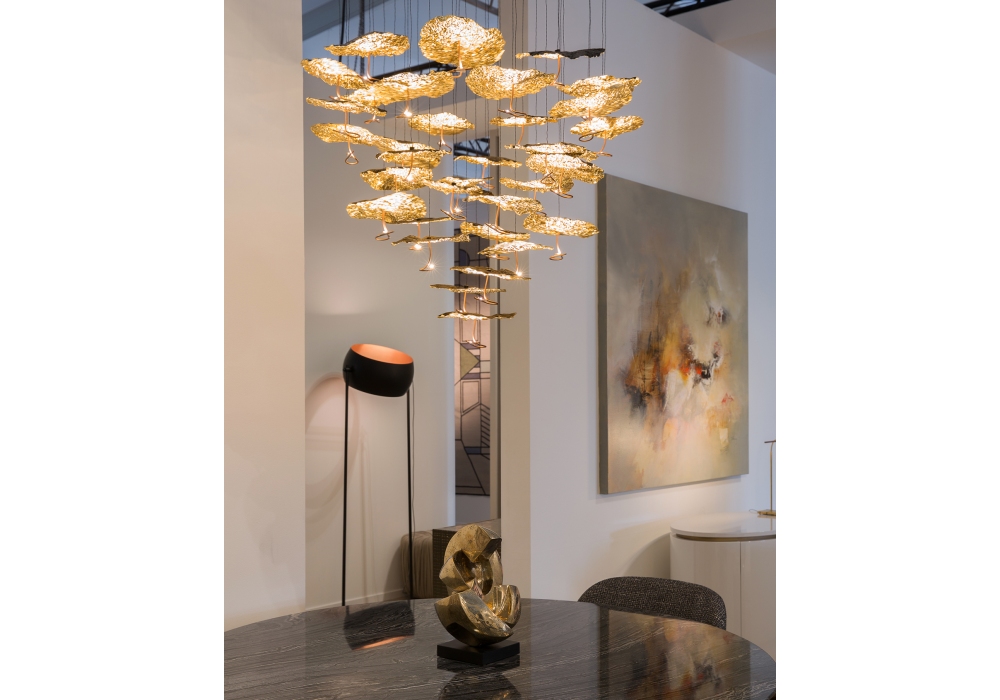 Gold Moon Chandelier diseñada por da Enzo Catellani para Catellani & Smith es una lámpara de suspensión con base en acero satinado, pantallas con acabado negro/pan de oro, rizos de cobre y jack de níquel. Los cables de suspensión son negros. La lámpara está disponible con 20, 25 o 35 LED.