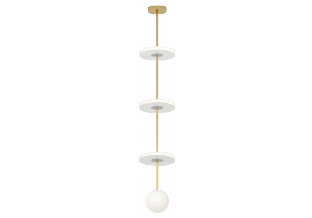 Discs Stacks Long diseñada por Atelier Areti es una lámpara de suspensión realizada en latón cepillado y un globo de cristal blanco. Disponible con discos de latón o acrílico blanco.