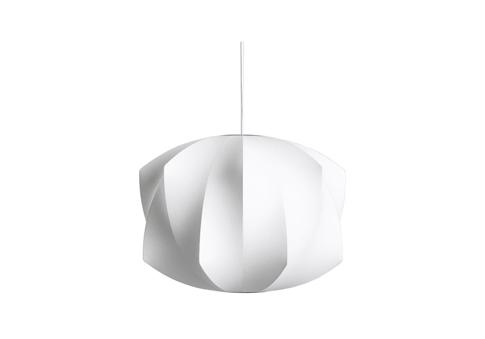 Nelson Propeller Bubble diseñada por George Nelson para Hay es una lámpara de suspensión realizada con una pantalla de polímero de cinta blanquecina. Marco superior e inferior de metal revestido y cepillado y marco de níquel. Cable aislante de PVC blanco.