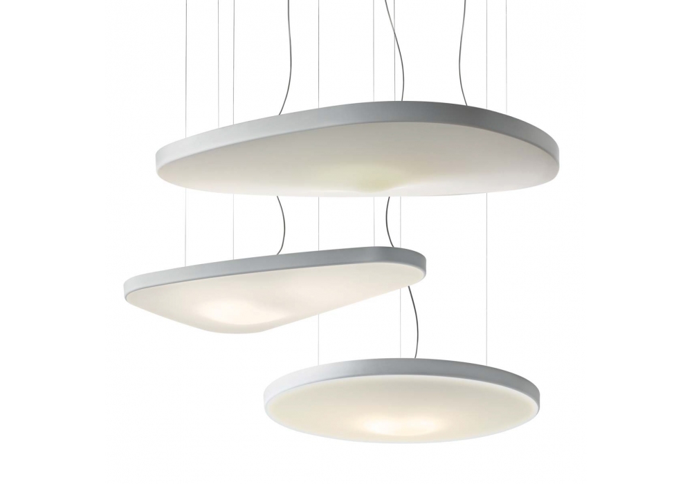 Pétale diseñada por Studio Odile Decq para Luceplan es una lámpara de suspensión realizada a partir de un panel fonoabsorbente revestido de tejido blanco. Es posible elegir el tipo de óptica y fuente de luz. Disponible en diferentes modelos.