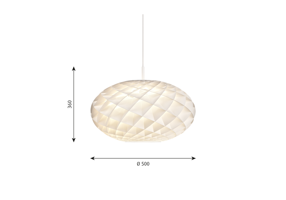 Patera Oval diseñada por Øivind Slaatto para Louis Poulsen es una lámpara de suspensión elipsoidal con estructura portante en policarbonato. El difusor es de PVC satinado blanco opal y apantalla una fuente de luz regulable halógena o LED alimentada por un cable de fibra textil blanco.