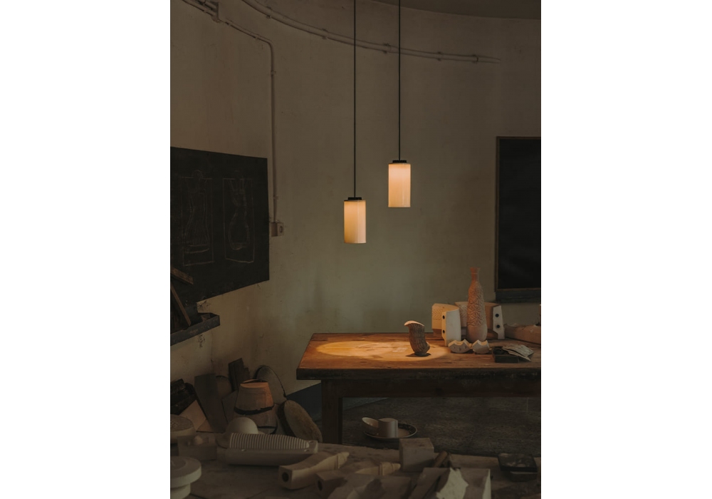 Cirio Simple diseñada por Antoni Arola para Santa&Cole es una lámpara de suspensión Led con pantalla en porcelana, cristal opalino o latón pulido. Rosetón blanco o negro.