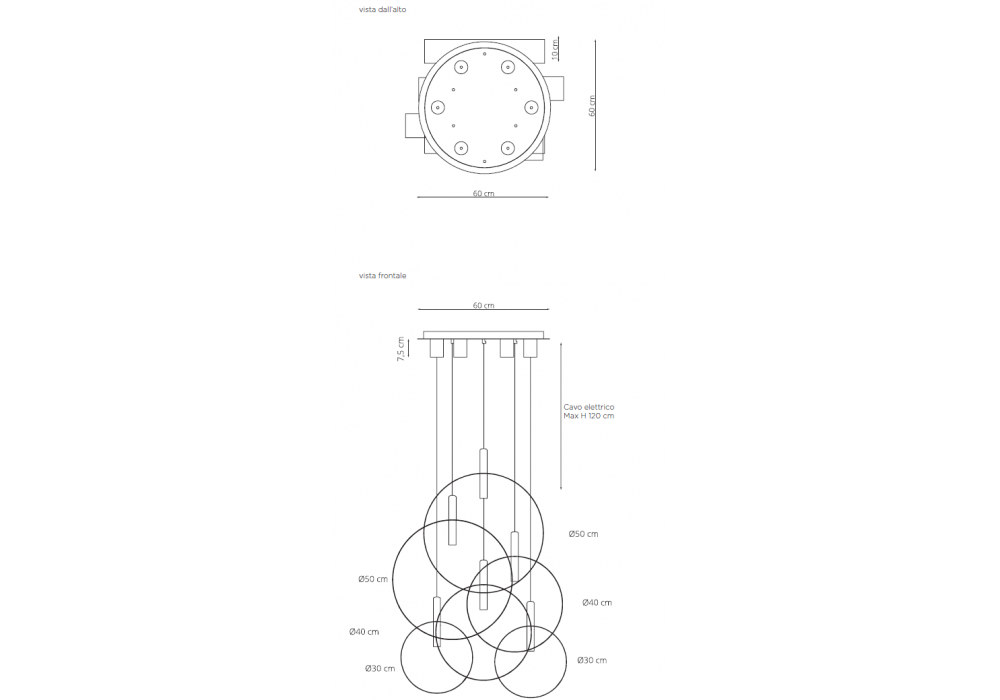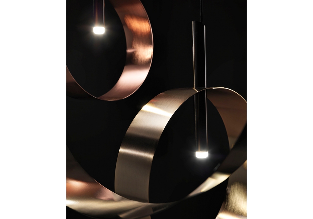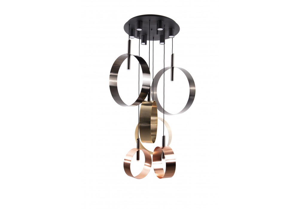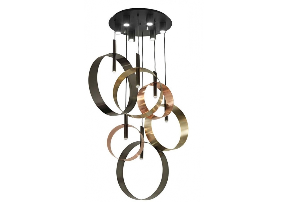 Led Loop S6 diseñada por Riflessi es una lámpara de suspensión formada por seis aros en tres tamaños diferentes. De la base descienden seis focos luminosos fijos con seis anillos pintados (2 cobre, 2 oro, 2 cromo negro) con tratamiento satinado galvánico, conectados a cables eléctricos en tela negra regulables en altura min. 60 máx. 120cm Bajo pedido es posible diseñar los difusores en el mismo acabado.