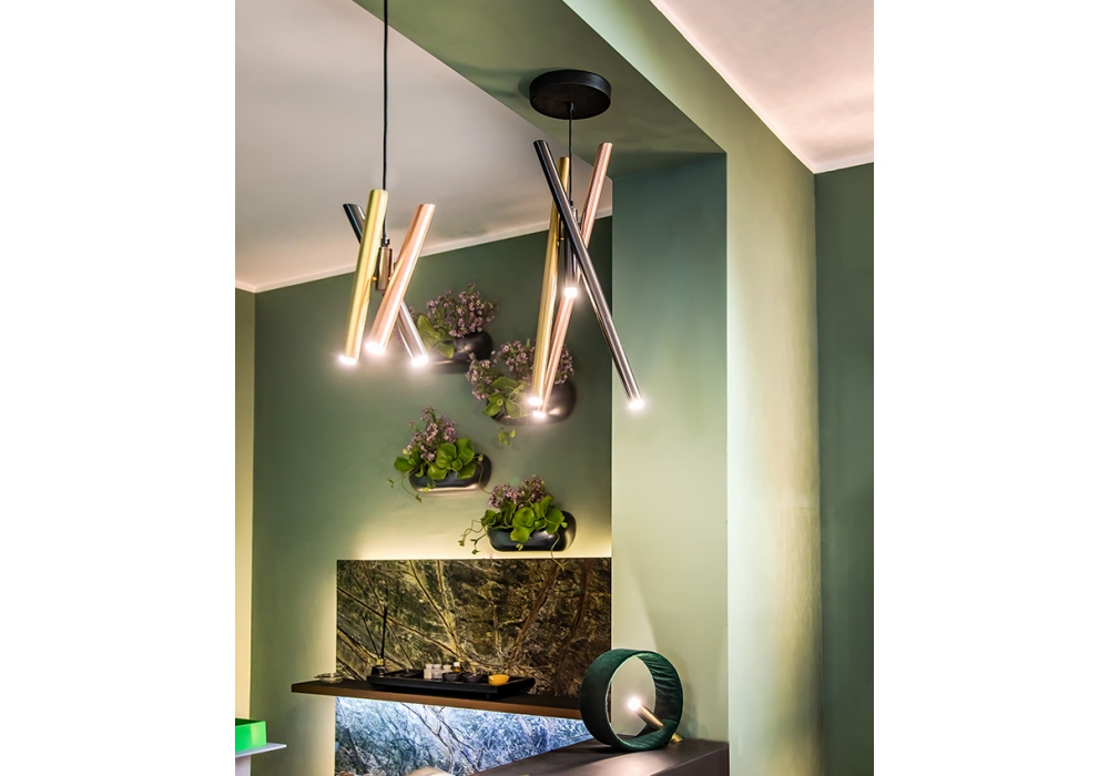 Shangai S6 diseñada por Riflessi es una lámpara de suspensión compuesta por tres tubos de metal pintados con tratamiento satinado galvánico. En la versión pequeña, la lámpara se compone de tres luces LED direccionales. En la versión grande la lámpara se compone de tres luces LED direccionales + 1 luz LED fija. Cable eléctrico en tejido negro regulable en altura máx. 120cm Disponible en diferentes acabados.
