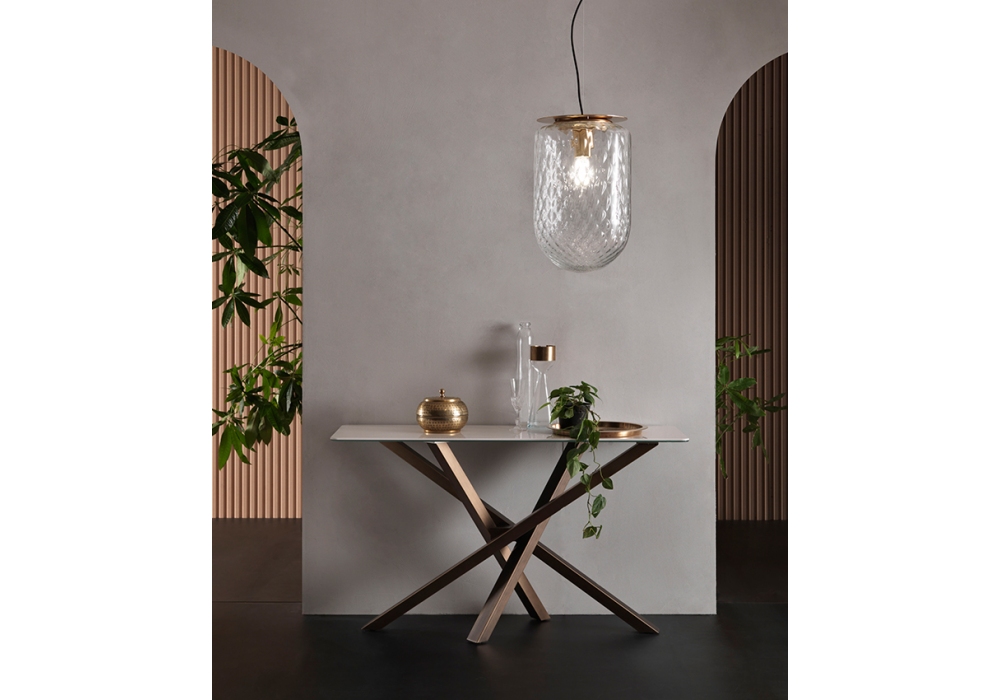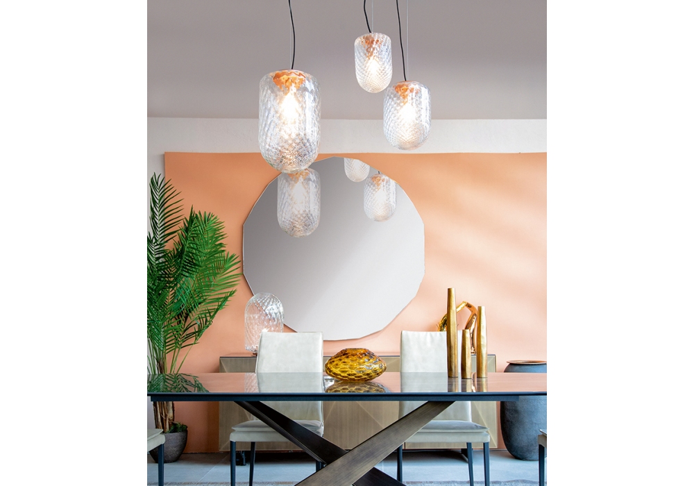 Tiffany S diseñada por Riflessi es una lámpara de suspensión realizada en cristal de Murano transparente. Disponible con estructura pintada en oro satinado o cromo negro satinado. Cable eléctrico en tejido negro. Disponible en diferentes dimensiones.