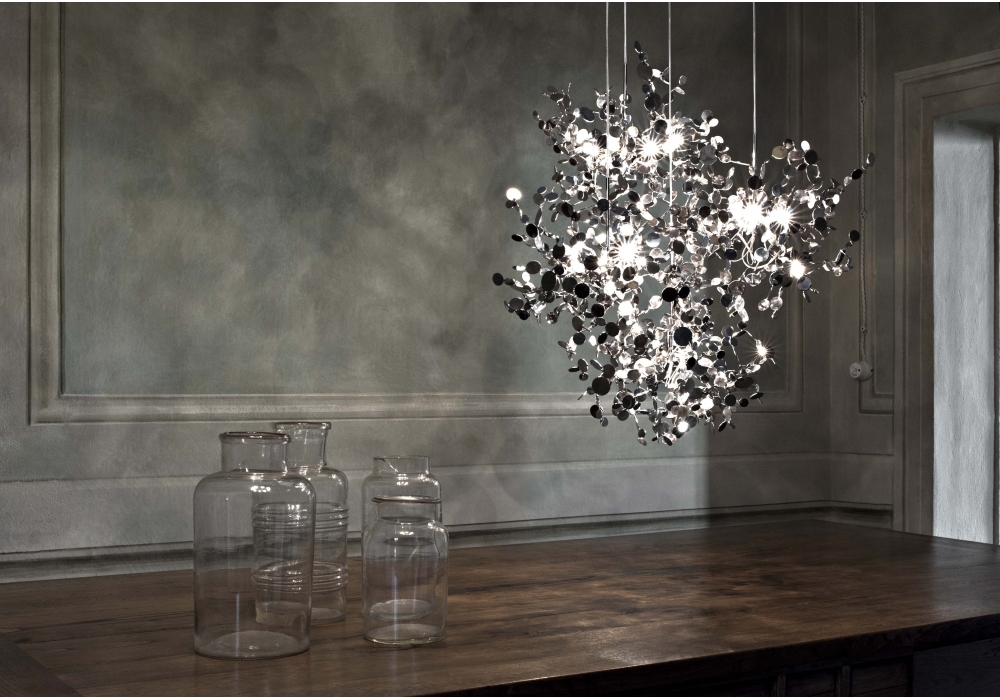 Argent Multi diseñada por Dodo Arslan para Terzani es una lámpara de suspensión con baldaquín de metal y colgantes estructurados por múltiples aplicaciones en acero chapado. La fuente de luz utilizada es LED o halógena regulable. Argent Multi está disponible en varios modelos y acabados.
