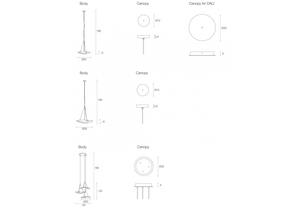 | Dimensiones | Ø 20 x H 190 cm (Mini); Ø 26 x H 190 cm (Medium); 34 x H 180 cm (3 Light). |