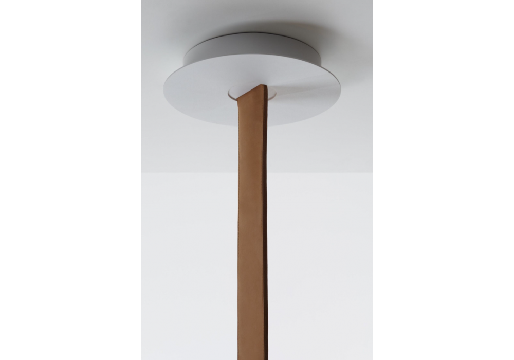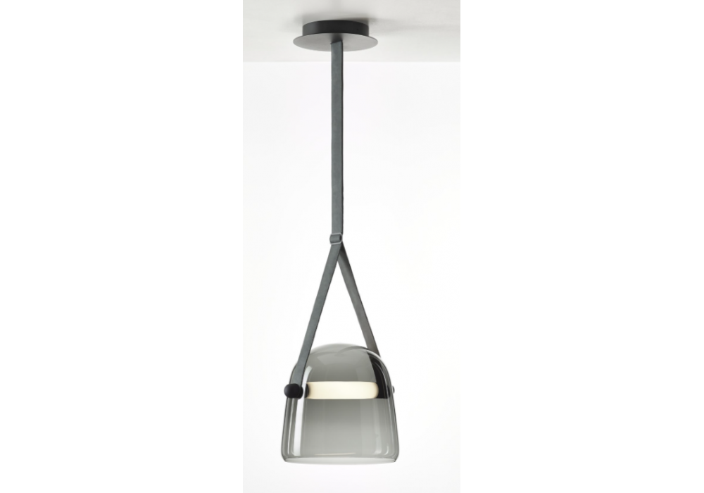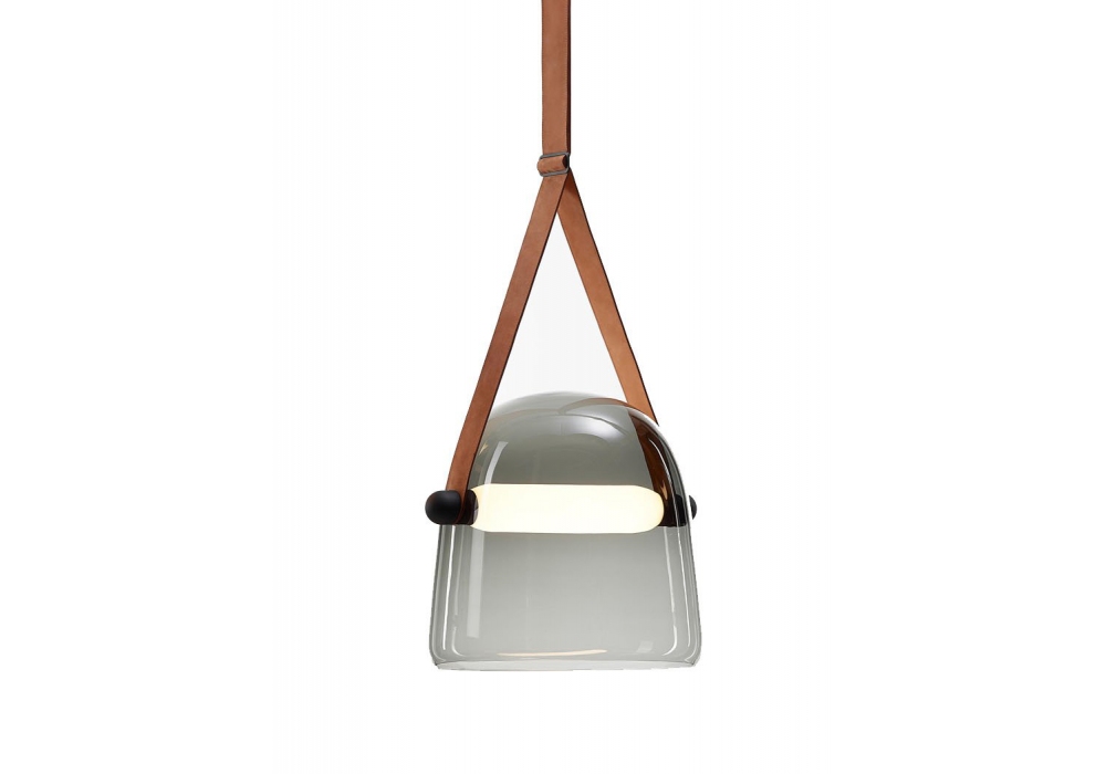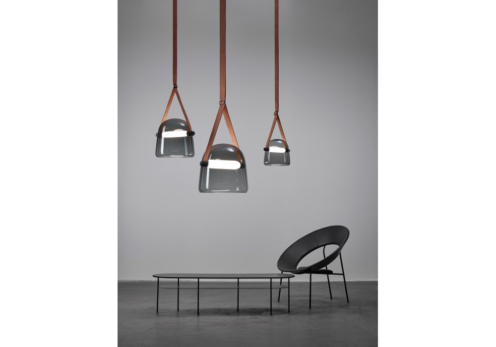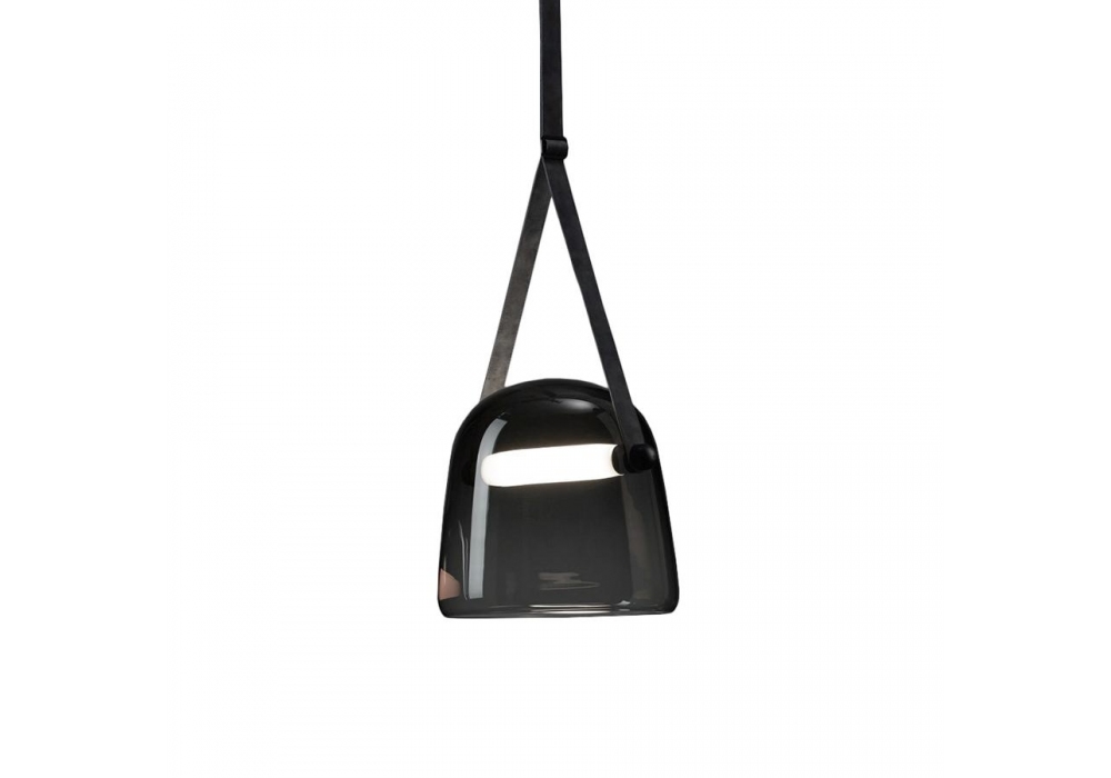 Mona Large, diseñada por Lucie Koldová para Brokis, es una lámpara de suspensión con difusor de vidrio soplado sujeto por una correa de cuero. La fuente de luz es un módulo LED regulable en diferentes versiones. Mona Large está disponible en diferentes acabados.