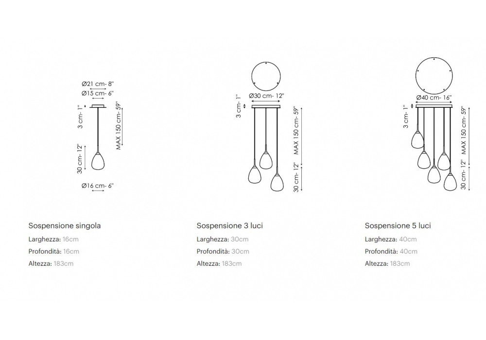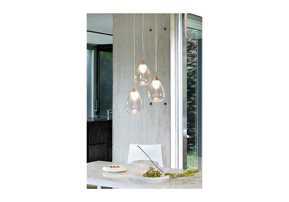 Gocce diseñada por Bartoli Design para Bonaldo es una lámpara de suspensión con pantalla compuesta por un cristal exterior transparente y un cristal interior arenado, la estructura es de metal pintado champagne. Disponible en diferentes modelos.