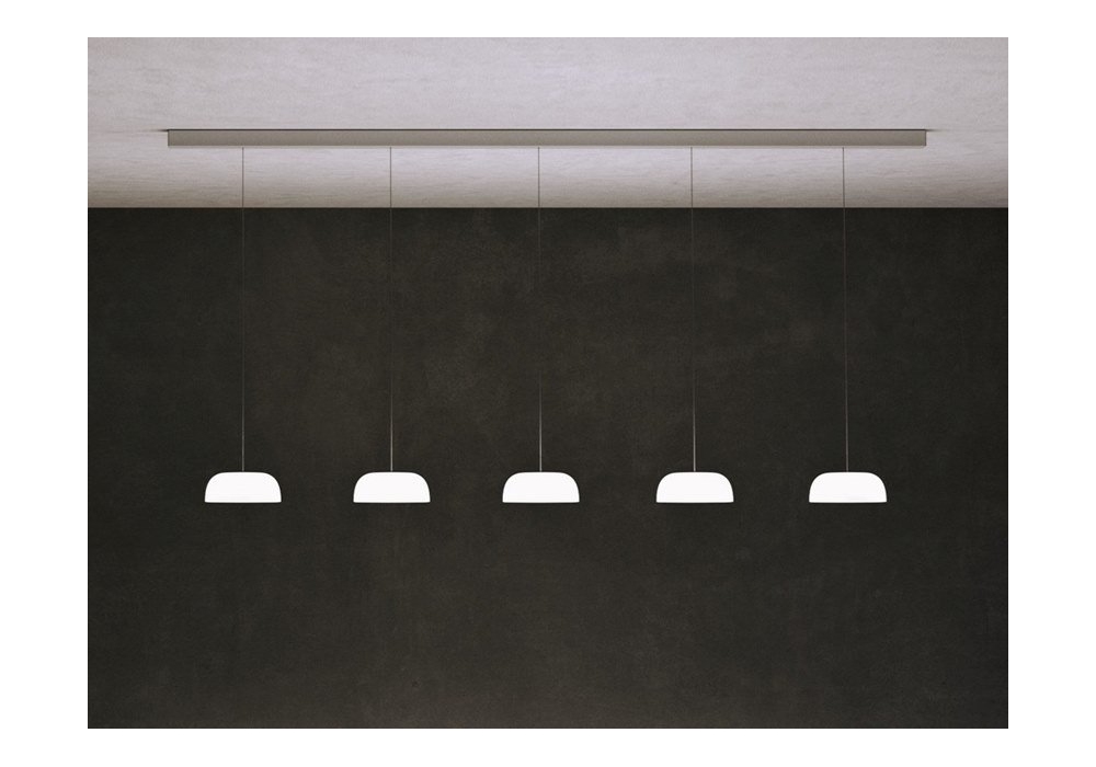 Tia Linear diseñada por Foster + Partner para Lumina es una lámpara de suspensión con cubierta cuadrangular de metal y cables de suspensión revestidos de fibra textil. Los difusores son circulares de vidrio soplado blanco y adoptan una fuente de luz LED regulable en diferentes versiones y tonalidades de luz. Tia Linear está disponible en diferentes modelos.