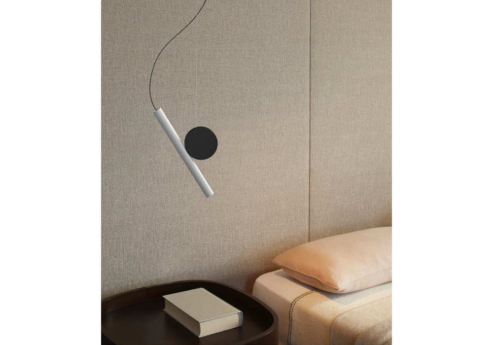 Doi diseñada por Meneghello Paolelli para Luceplan es una lámpara de suspensión con cilindro en aluminio rayado negro, latón o blanco con contrapeso de hierro en diferentes acabados. Puede elegir entre dimmer DALI o corte de fase. Accesorio de contrapeso disponible.