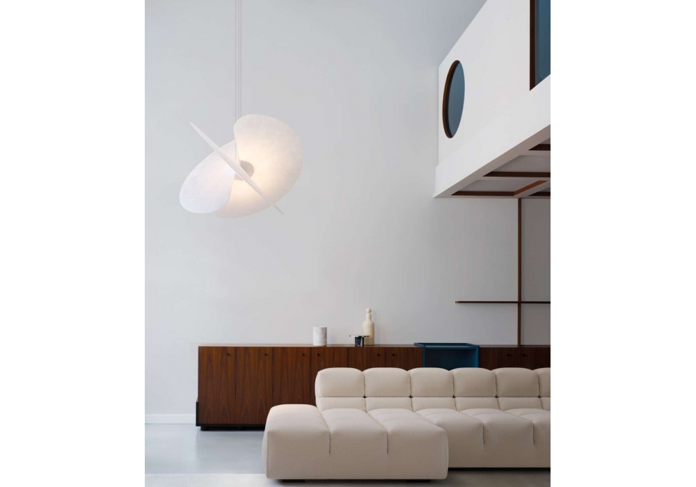 Levante diseñada por Marco Spatti para Luceplan es una lámpara de suspensión con estructura en aluminio blanco mate y difusor en PET. Disponible en dos dimensiones.