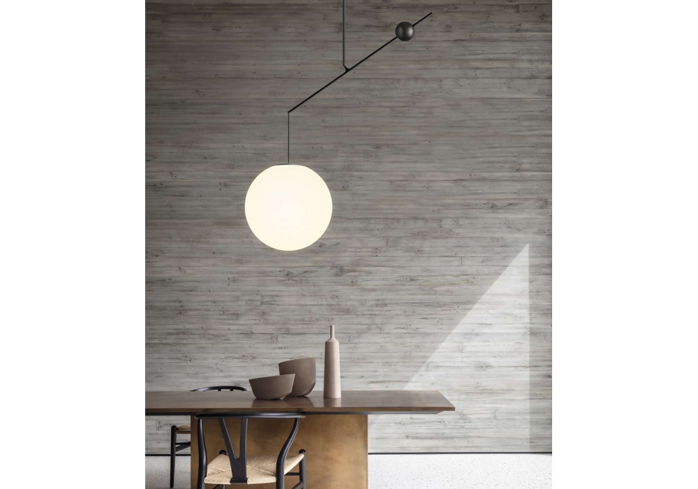 Malamata diseñada por Shulab para Luceplan es una lámpara de suspensión con estructura en acero negro mate o latón cepillado y difusor en vidrio soplado blanco opal. La luz se puede ajustar gracias a un contrapeso de bola. Al presionar el botón que se encuentra arriba, se libera un resorte y el contrapeso queda libre para deslizarse sobre el brazo.