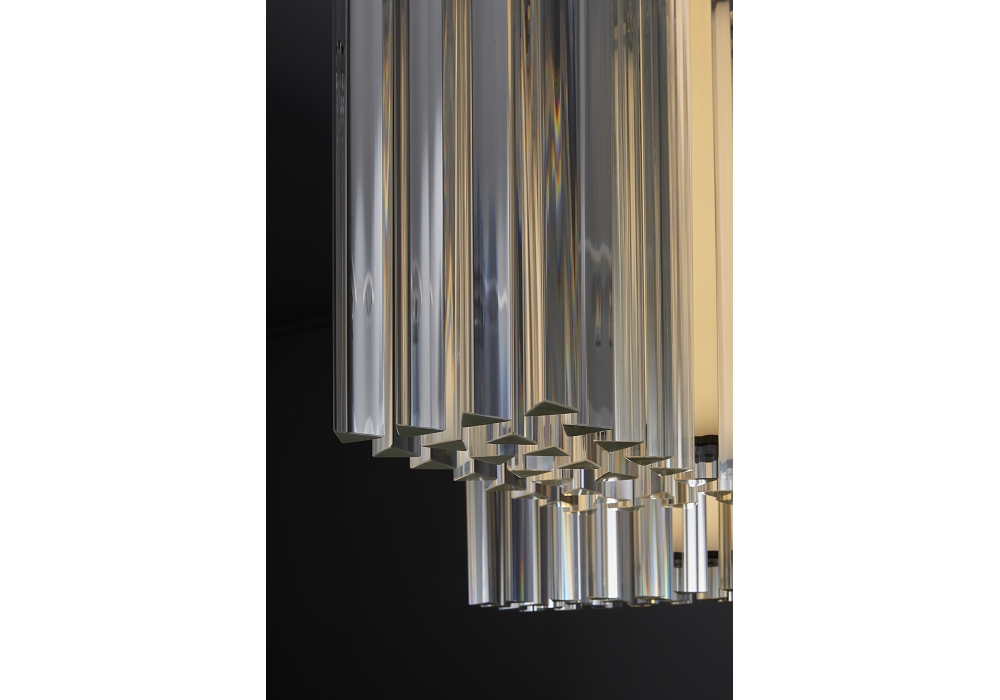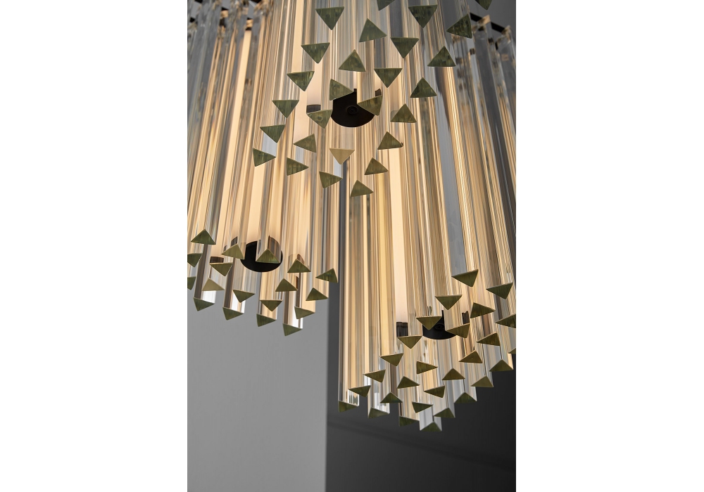 Grace diseñada por Massimo Tonetto para Venicem es una lámpara de suspensión con luz difusa. Estructura de metal negro mate con cables de acero, compuesta por triedros triangulares de cristal. Tiras de LED en el interior del cuerpo cilíndrico central. El kit de atenuación y el rosetón se venden por separado.