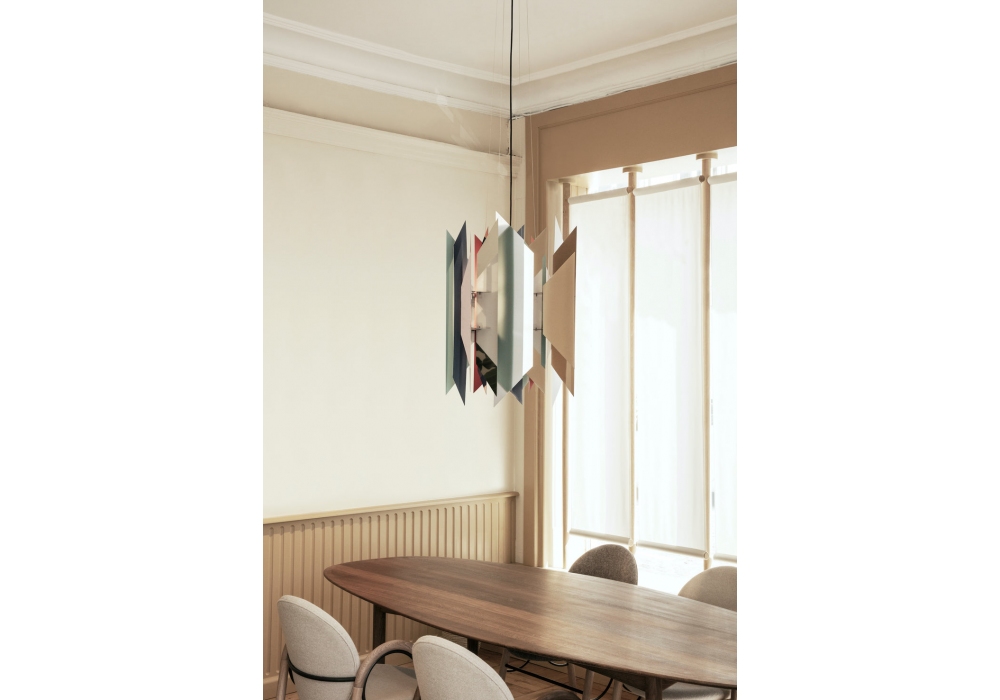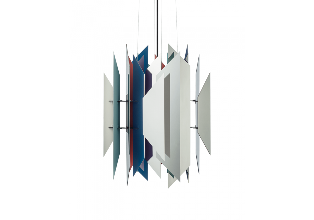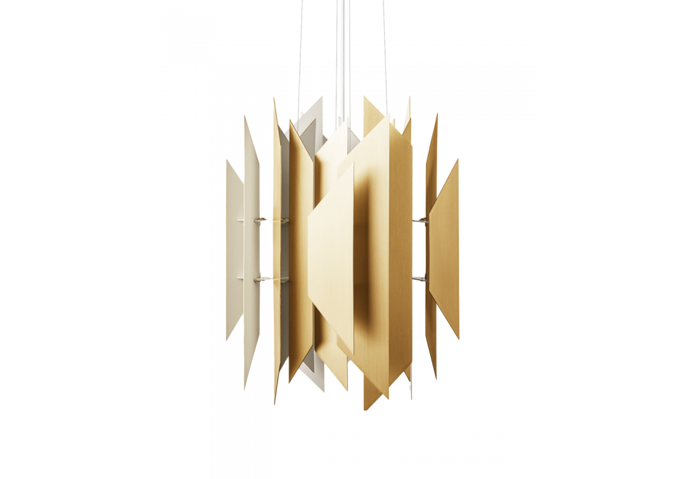 Divan 2 diseñada por Simon P. Henningsen para Lyfa es una lámpara de suspensión en latón macizo o en la versión original en acero inoxidable pulido con trapecios multicolores. Disponible en diferentes acabados y varios tamaños.