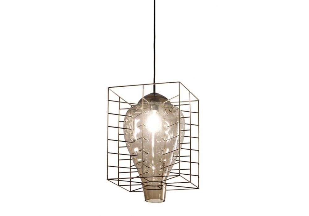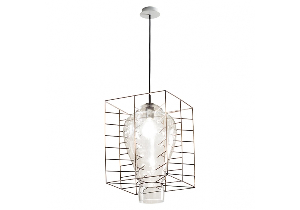 Attimo diseñada por Domenico Rinaldi para Fisionarte es una lámpara de suspensión estructurada por una jaula de acero crudo y un marco negro mate. El difusor tiene forma redondeada en cristal de Murano y alberga una fuente de luz con casquillo E27 alimentado por un cable de fibra textil negro. Attimo está disponible en versiones de interior y exterior en diferentes acabados de vidrio.