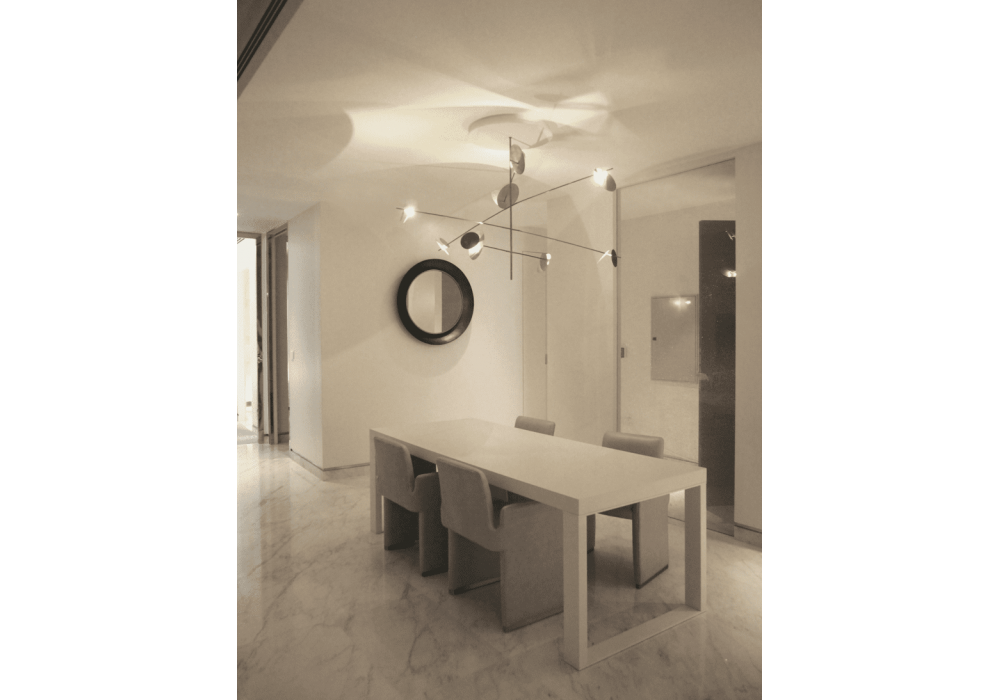 Ovni diseñada por Ombre Portée es una lámpara de suspensión realizada en latón cepillado y encerado. Box driver de madera pintada.