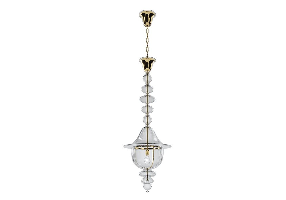 Doge 839.00 diseñada por Napoleone Martinuzzi para Venini es una lámpara de suspensión en vidrio soplado con procesamiento rigadin, disponible en diferentes acabados. La cadena y las piezas de metal son de color dorado.