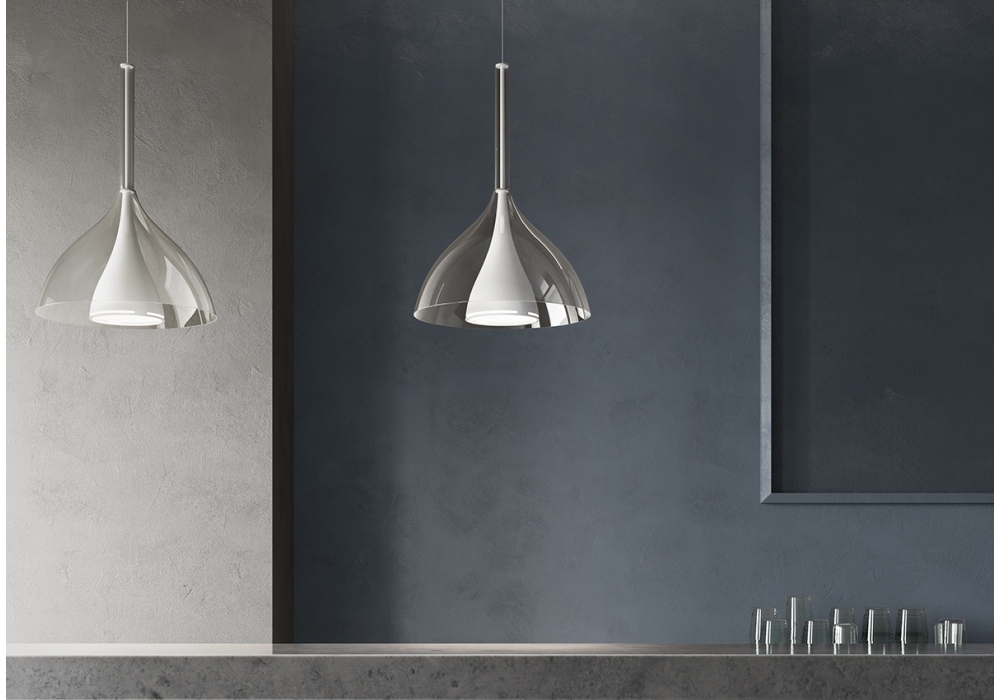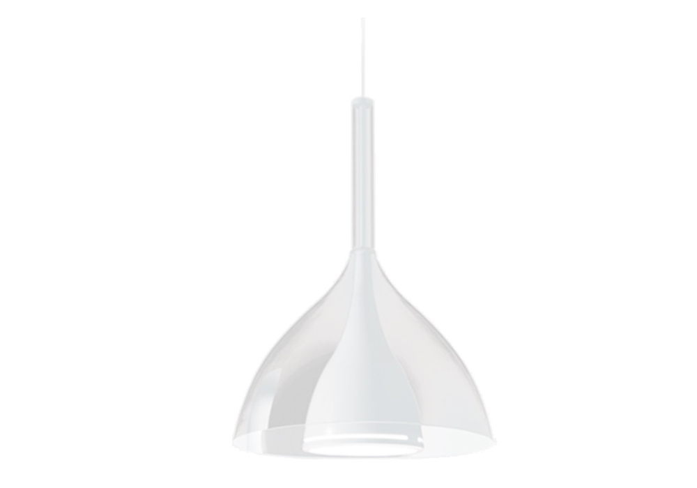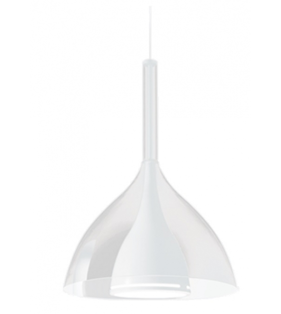 Floob diseñada por Karim Rashid para Kundalini es una lámpara de suspensión de luz directa realizada en plexiglás termoformado y extruido con reflector de aluminio torneado y cortado con láser y difusor de vidrio grabado.
