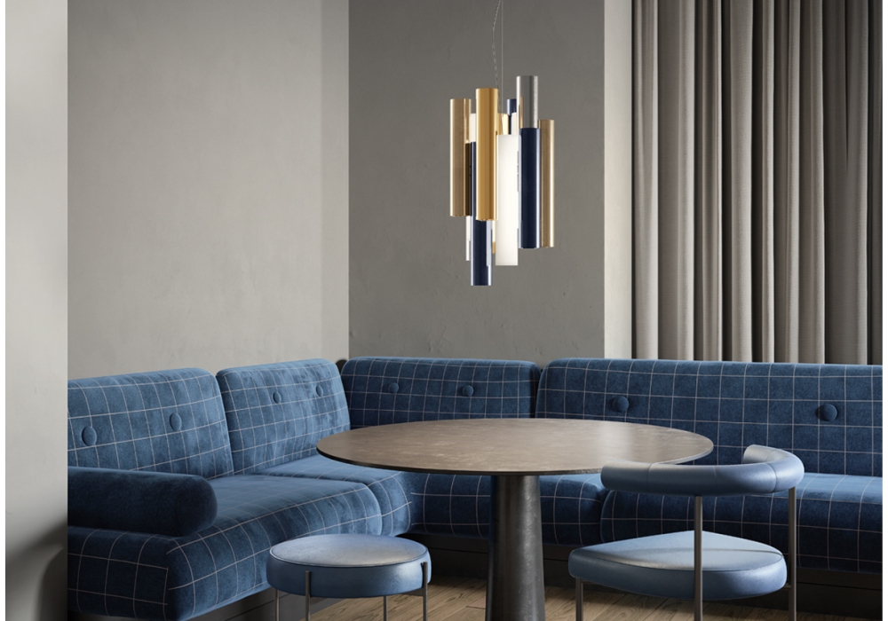 Toot diseñada por Karim Rashid para Kundalini es una lámpara de suspensión regulable con difusores en plexiglás coloreado o satinado y estructura en metal pintado.