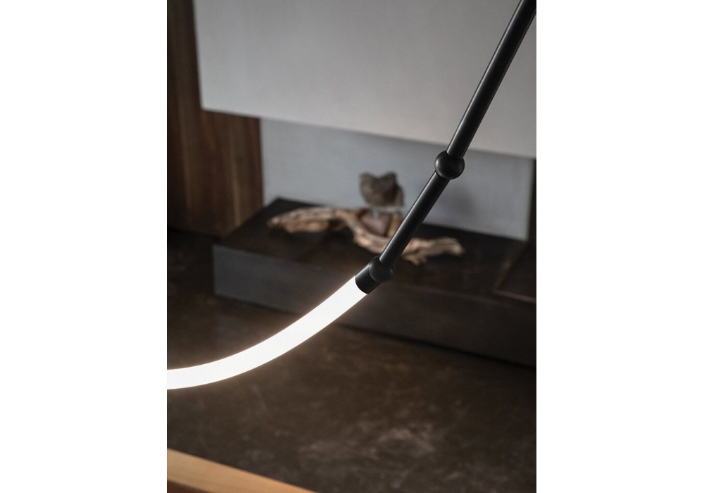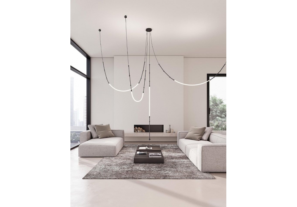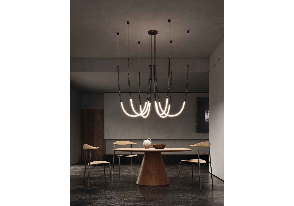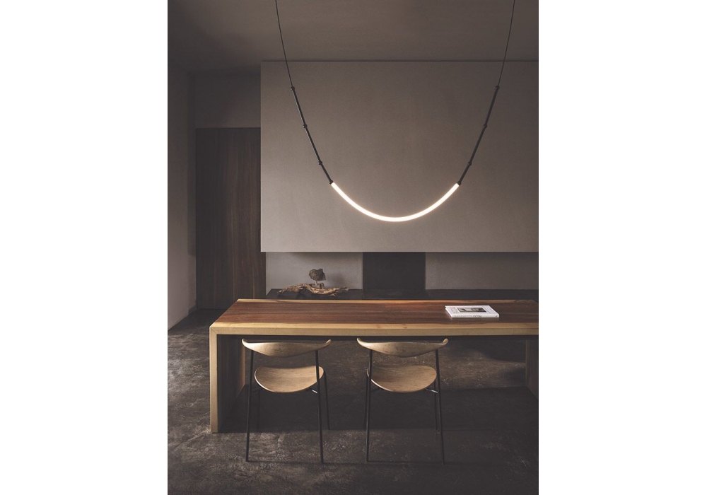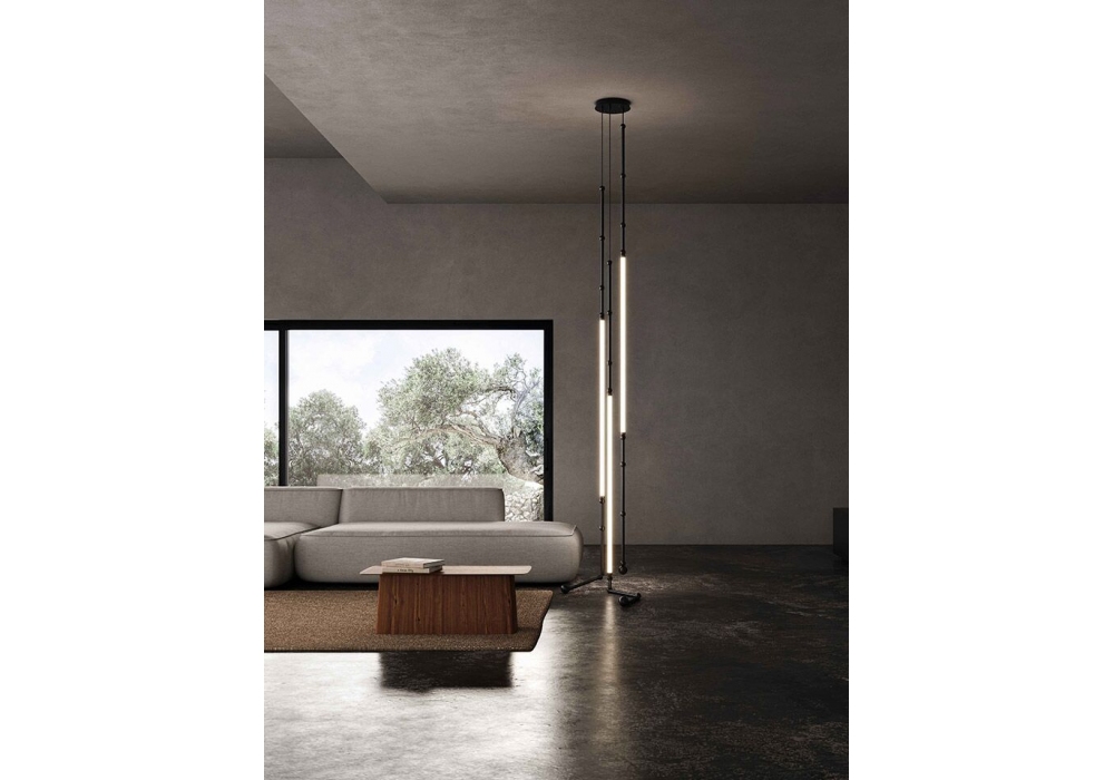 Leda diseñada por Luca De Bona & Dario De Meo para Karman es una lámpara de suspensión con estructura de aluminio negro mate o bronce mate y difusor de silicona blanca. Disponible en diferentes modelos. Uso interno.