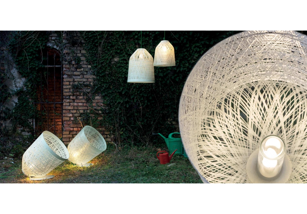 Black Out Outdoor diseñada por Matteo Ugolini para Karman es una lámpara colgante de filamento de fibra de vidrio disponible en 2 acabados y 2 dimensiones. Bombilla no incluida.