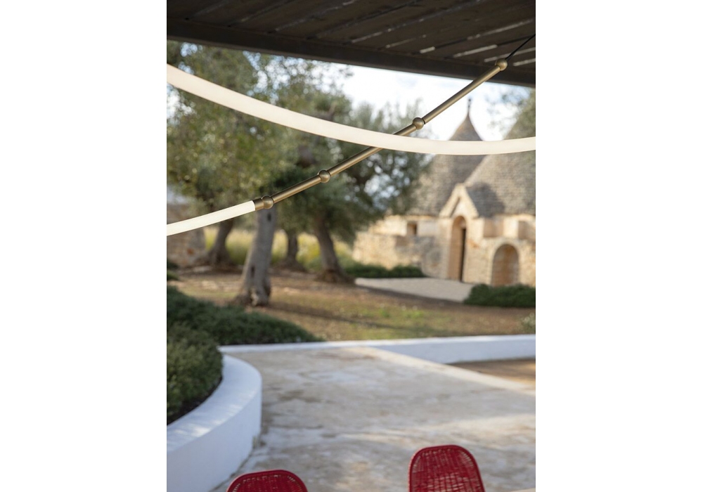 Leda Outdoor diseñada por Luca De Bona & Dario De Meo para Karman es una lámpara de suspensión con estructura de aluminio negro mate o bronce mate y difusor de silicona blanca. Disponible en diferentes modelos. Uso externo.