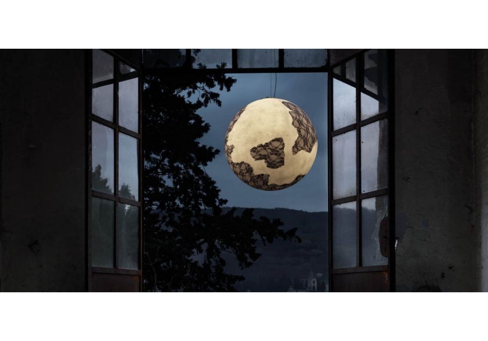 Ululà Outdoor diseñada por Matteo Ugolini para Karman es una lámpara de suspensión en fibra de vidrio y encaje blanco.