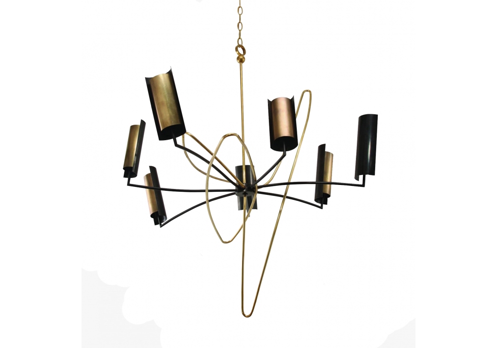 Sputnik producido y firmado por Porta Romana es un candelabro con una estructura portante en bronce y metal pintado en latón. Las pantallas son cilíndricas en metal y apantallan una fuente de luz con conexión LED tipo G9.