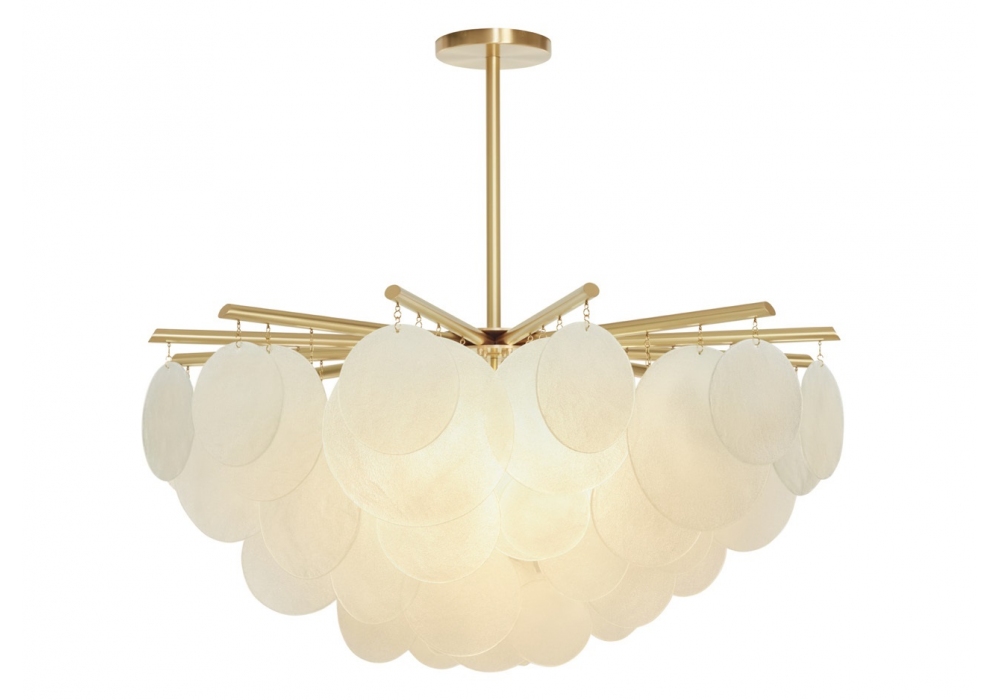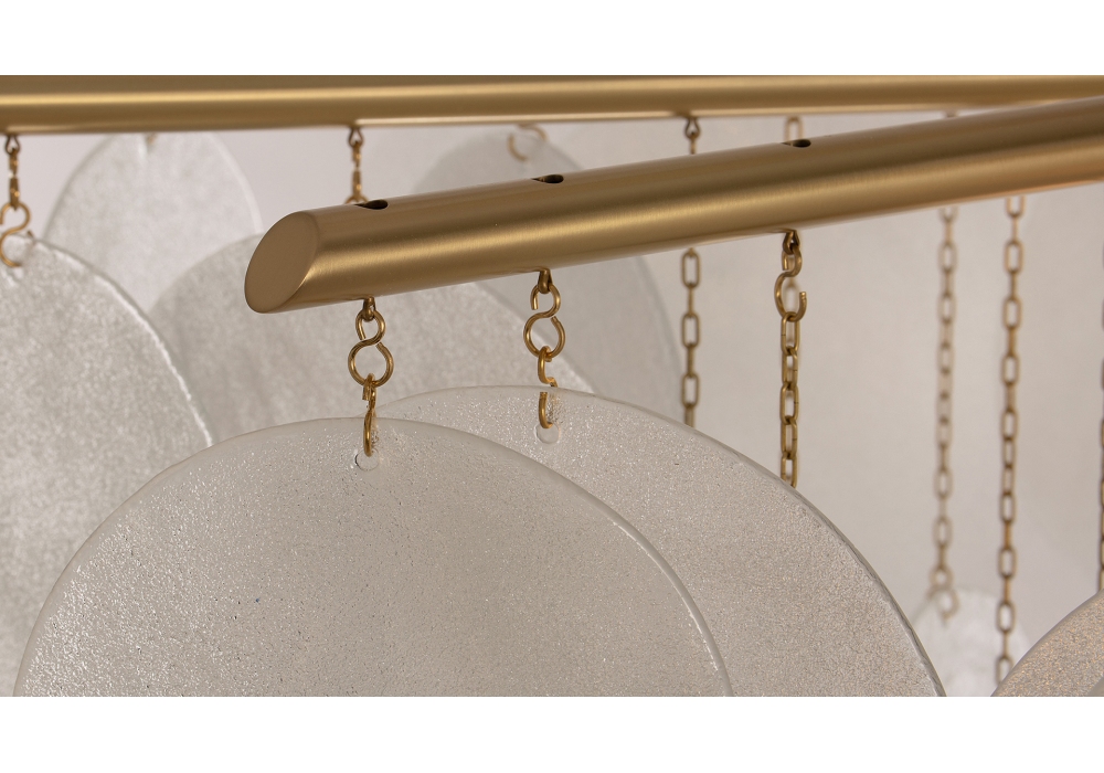 Nimbus Round diseñada por CTO Lighting es una lámpara de suspensión realizada con estructura en latón satinado o bronce y discos de cristal semiacabados hechos a mano. Disponible en 2 dimensiones.