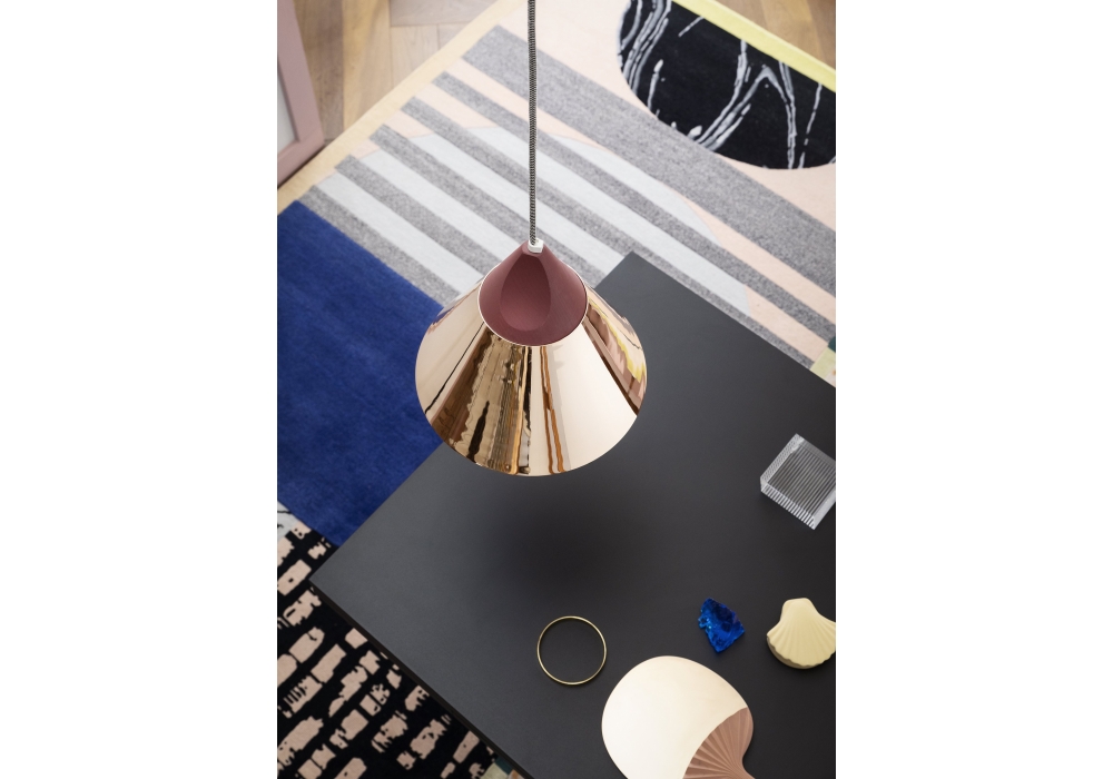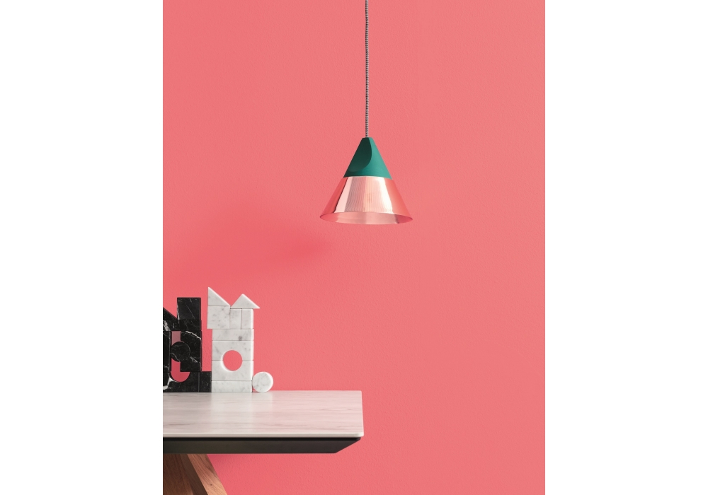 Slope diseñada por Skrivo para Miniforms es una gran lámpara de suspensión con parte superior disponible en haya natural o anilina negra. Pantalla disponible en diferentes colores.