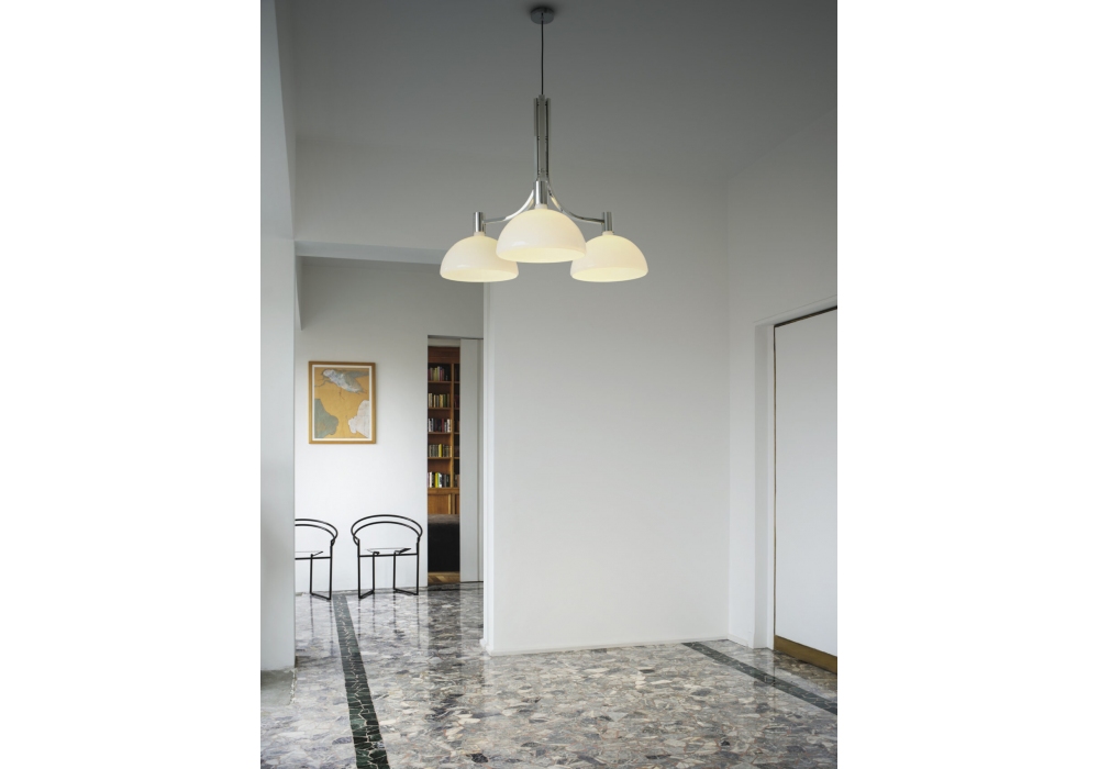 AS43C diseñada por F.Albini, F.Helg, A.Piva, M.Albini para Nemo es una araña con estructura portante en metal cromado o negro. Los difusores son de cristal opal blanco y apantallan una fuente de luz LED o halógena con casquillo E27. AS43C está disponible en diferentes acabados.