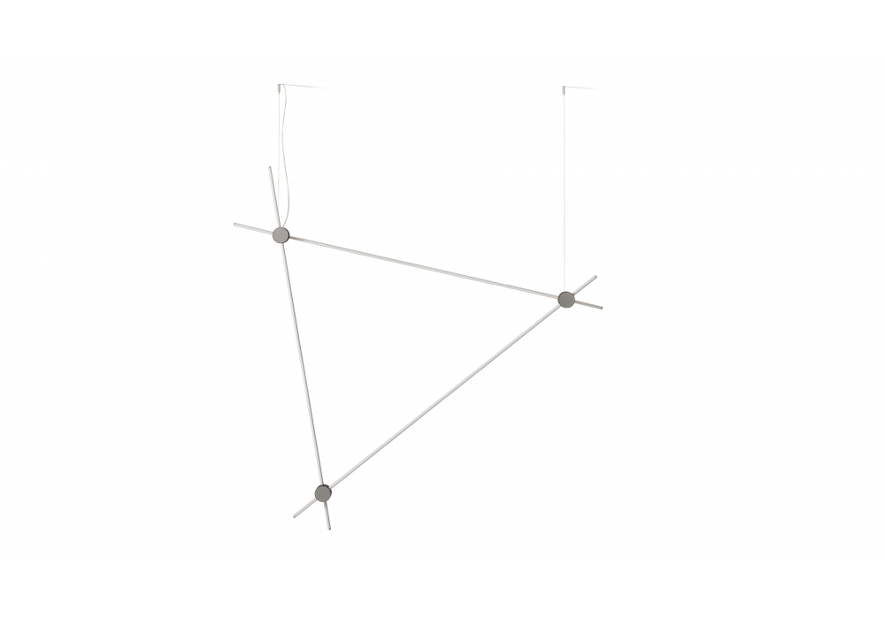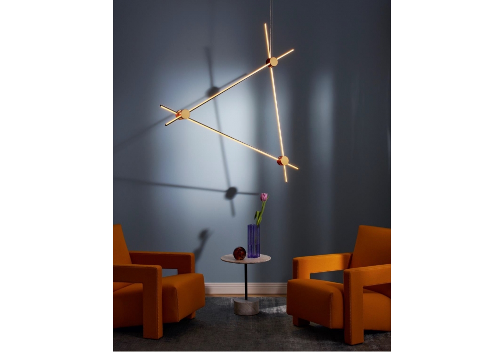 EITIE Triangle Vertical diseñada por Tobia Scarpa para Cassina es una lámpara de suspensión realizada en aluminio y PC, con juntas de metal lacado en diferentes acabados. Compuesto por tres tiras de LED.