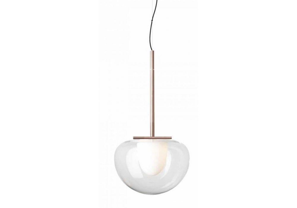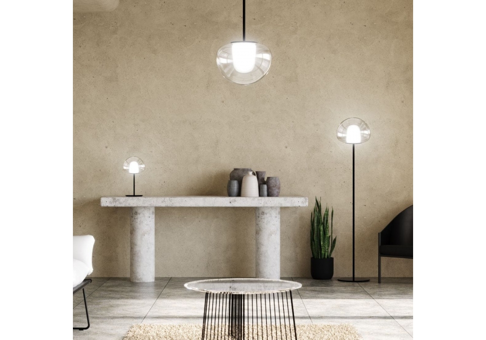 Thea diseñada por Gabriele y Oscar Buratti para Fontana Arte es una lámpara de suspensión de luz difusa regulable con estructura en metal galvanizado. Difusor interno de vidrio soplado blanco opalino al ácido, difusor externo disponible en vidrio transparente o coloreado. El cable de suspensión es de acero y el rosetón es de metal pintado de blanco.