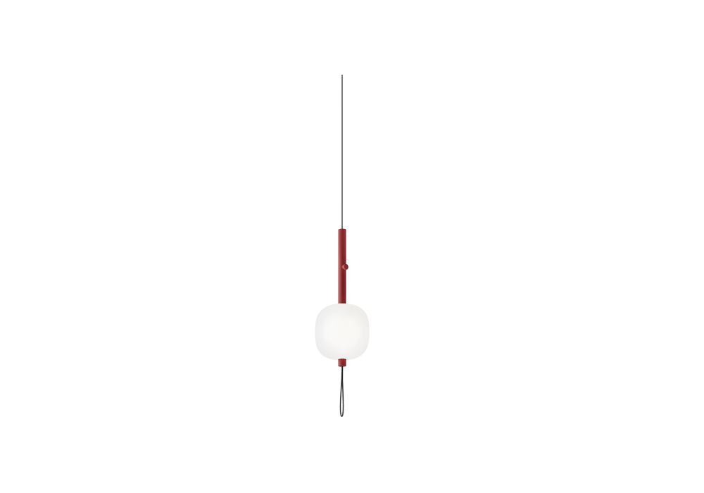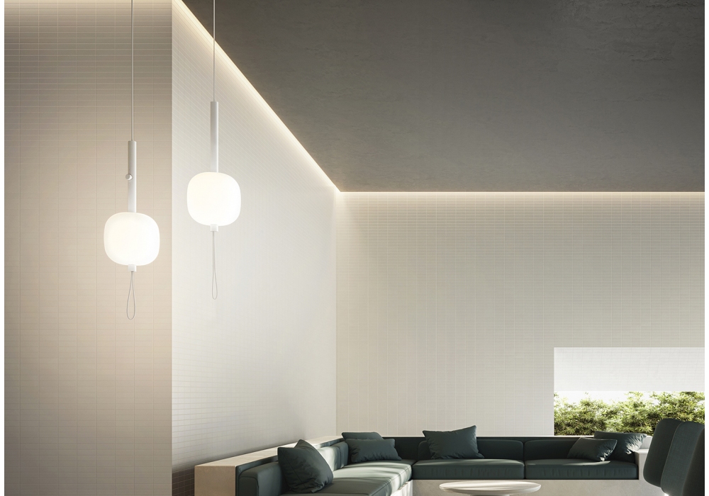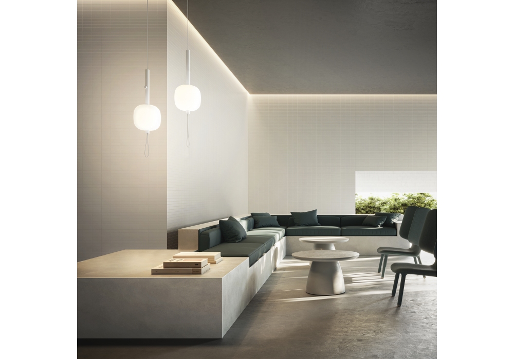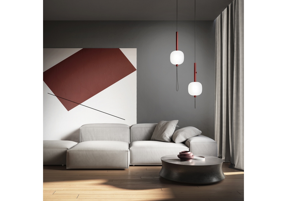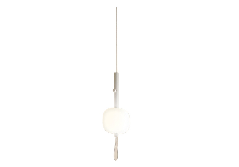 Motus diseñada por Shulab para Kundalini es una lámpara de suspensión regulable en altura. El difusor está fabricado en cristal opal y la estructura en metal pintado.