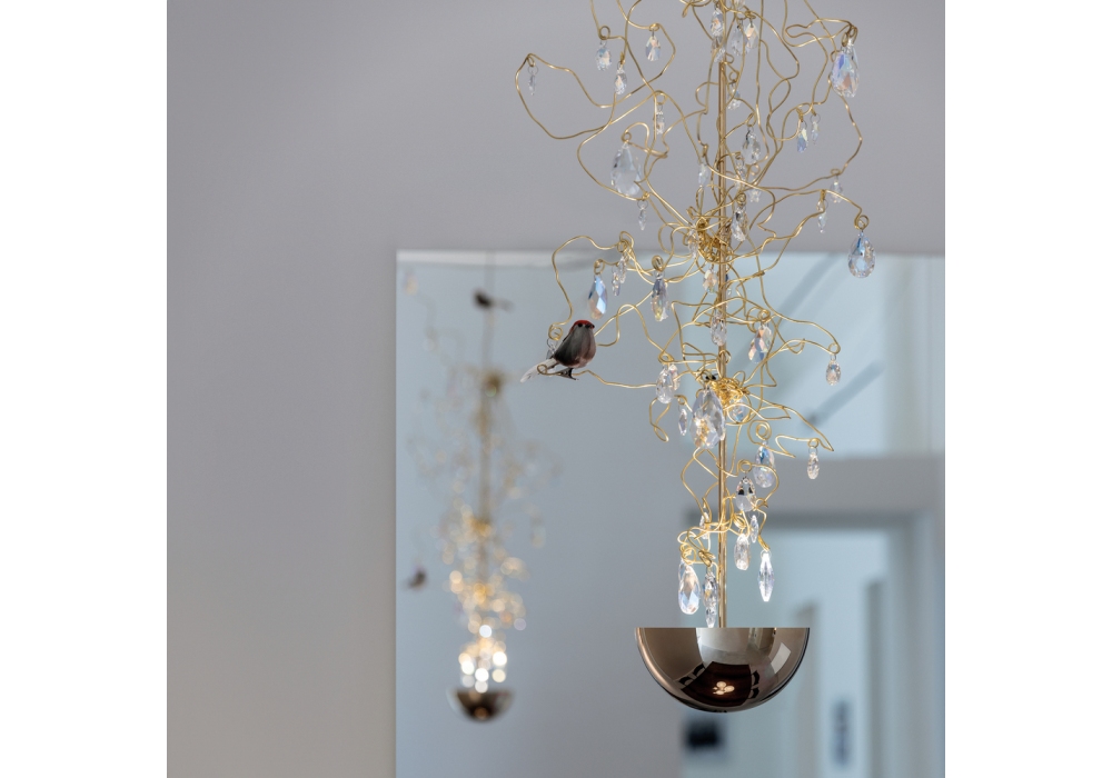 Louis XIV diseñada y producida por Davide Groppi es una lámpara de suspensión de doble emisión completamente estructurada en metal con colgantes de cristal. El tallo vertical es dorado mientras que el difusor tiene forma circular pintado de negro y adopta fuentes de luz LED regulables en diferentes versiones y gradaciones de luz.