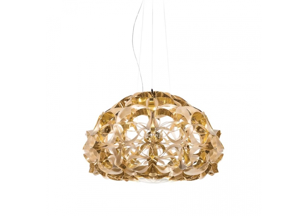 Quantica diseñada por Adriano Rachele para Slamp es una lámpara de suspensión de forma redondeada estructurada por múltiples elementos de cinta en Opalflex® dorado. Las fuentes de luz adoptadas son del tipo LED de filamento regulable. Quantica está disponible en diferentes modelos.