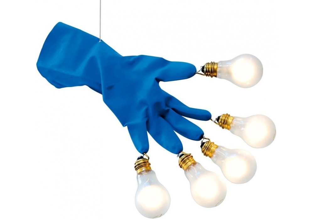 Luzy Take Five diseñada y producida por Ingo Maurer es una lámpara de suspensión compuesta por un guante azul con una bombilla esmerilada en la punta de los dedos. La estructura es de plástico y metal, las lámparas de bajo voltaje.