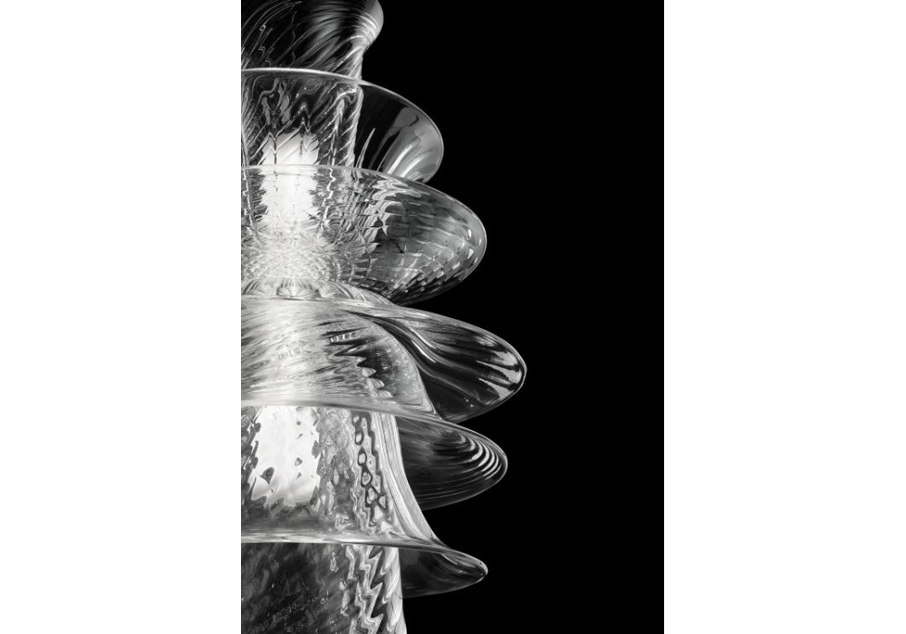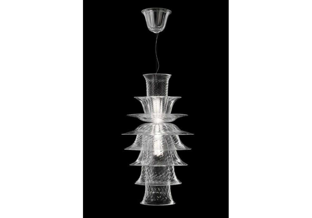 Campanula diseñada por García Cumini para Barovier & Toso es una lámpara de suspensión con estructura portante y detalles en metal color cromo pulido. El cuerpo de la lámpara y el difusor están estructurados por una serie de elementos circulares de vidrio colocados uno al lado del otro. La fuente de luz adoptada es del tipo LED regulable. Campanula está disponible en diferentes modelos y acabados.