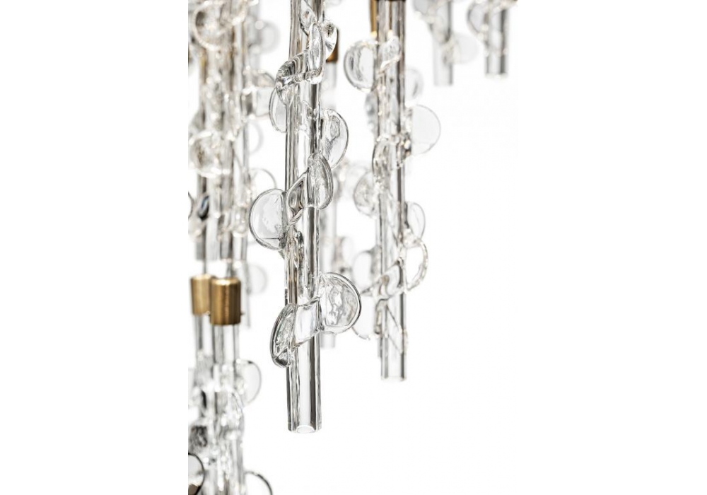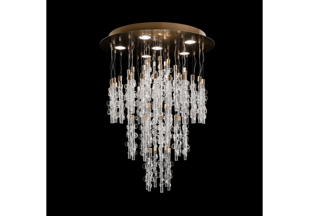 Germogli diseñada y producida por Barovier & Toso es una lámpara de suspensión con una estructura de soporte circular en cromo pulido o metal dorado cepillado. Los colgantes son de cristal veneciano y metal. Las fuentes de luz colocadas en la estructura portante son del tipo LED regulables. Germogli está disponible en diferentes modelos y acabados.