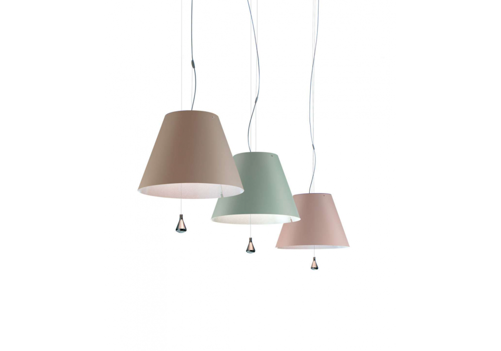 Costanza diseñada por Paolo Rizzatto para Luceplan es una lámpara de suspensión con cuerpo en aluminio y pantalla intercambiable en policarbonato serigrafiado. En la versión con pestillo hay un contrapeso en acero cromado mate.