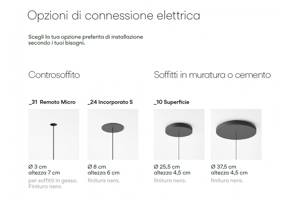 | Florón | Ø 3 x H 7 cm (Remoto Micro); Ø 8 x H 6 cm (Incorporato S); Ø 25,5 x H 4,5 cm (Superficie); Ø 37,5 x H 4,5 cm (Superficie). |