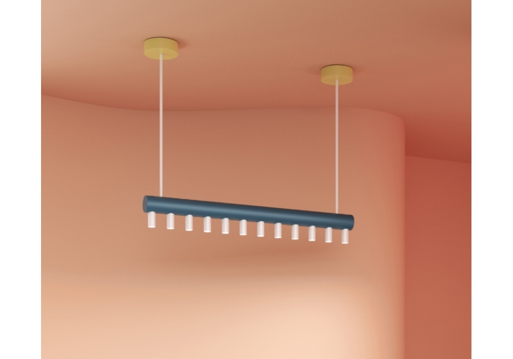 Array diseñada por Atelier Areti es una lámpara de suspensión realizada en metal pintado, disponible en diferentes acabados. Bajo pedido, también es posible personalizar los colores de los tubos y del rosetón.