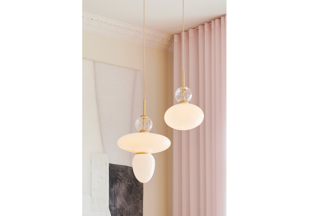 Rizzatto diseñada por Paolo Rizzatto para Nuura es una lámpara de suspensión con pantalla de vidrio soplado opal y aros de metal satinado. Entre la varilla y el anillo metálico se encuentra una esfera de cristal transparente.