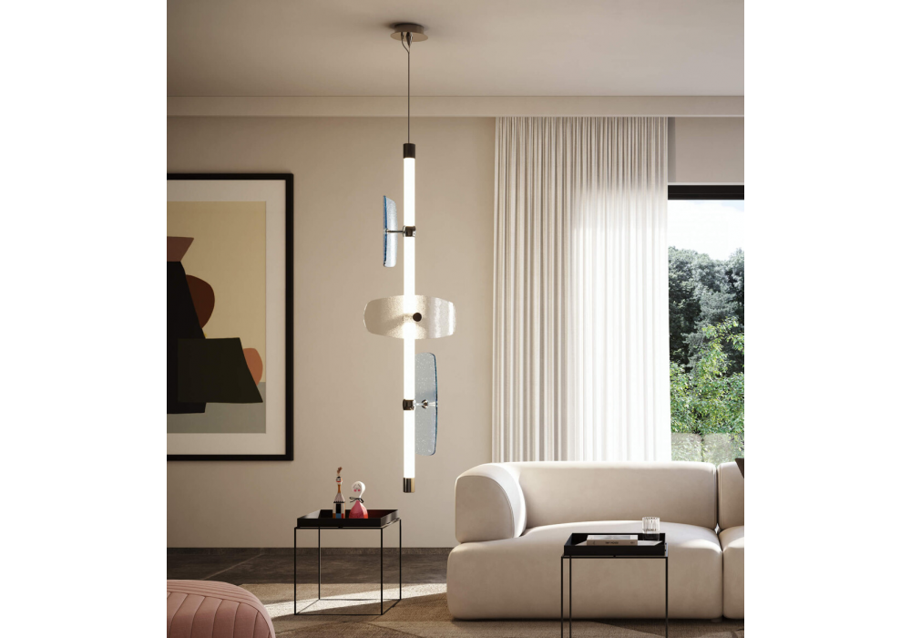 Axi diseñada por Patrick Jound Id para Italamp es una lámpara de suspensión caracterizada por una estructura tubular de vidrio borosilicato blanco que contiene una fuente de luz LED, intercalada con elementos metálicos de los que se extienden brazos sobre los que se fijan paneles de vidrio artístico de colores, que gravitan alrededor del elemento central.